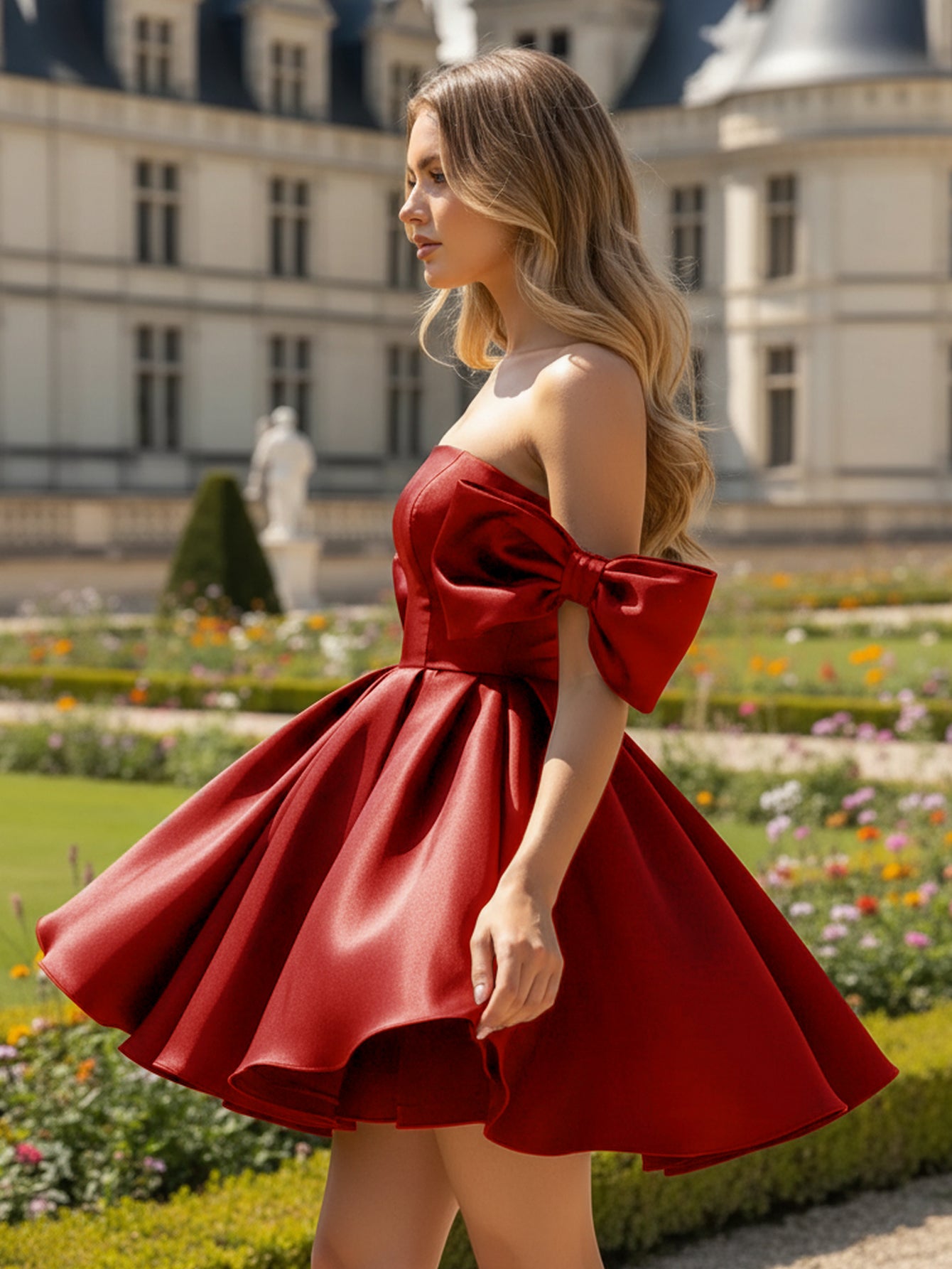 Square Satin Mini Ball Gown Prom Dress With Bow - Red