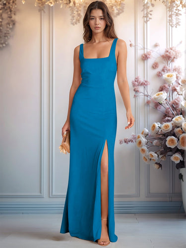 Square Sheath Floor Length Bridesmaid Dress With Split - Blue