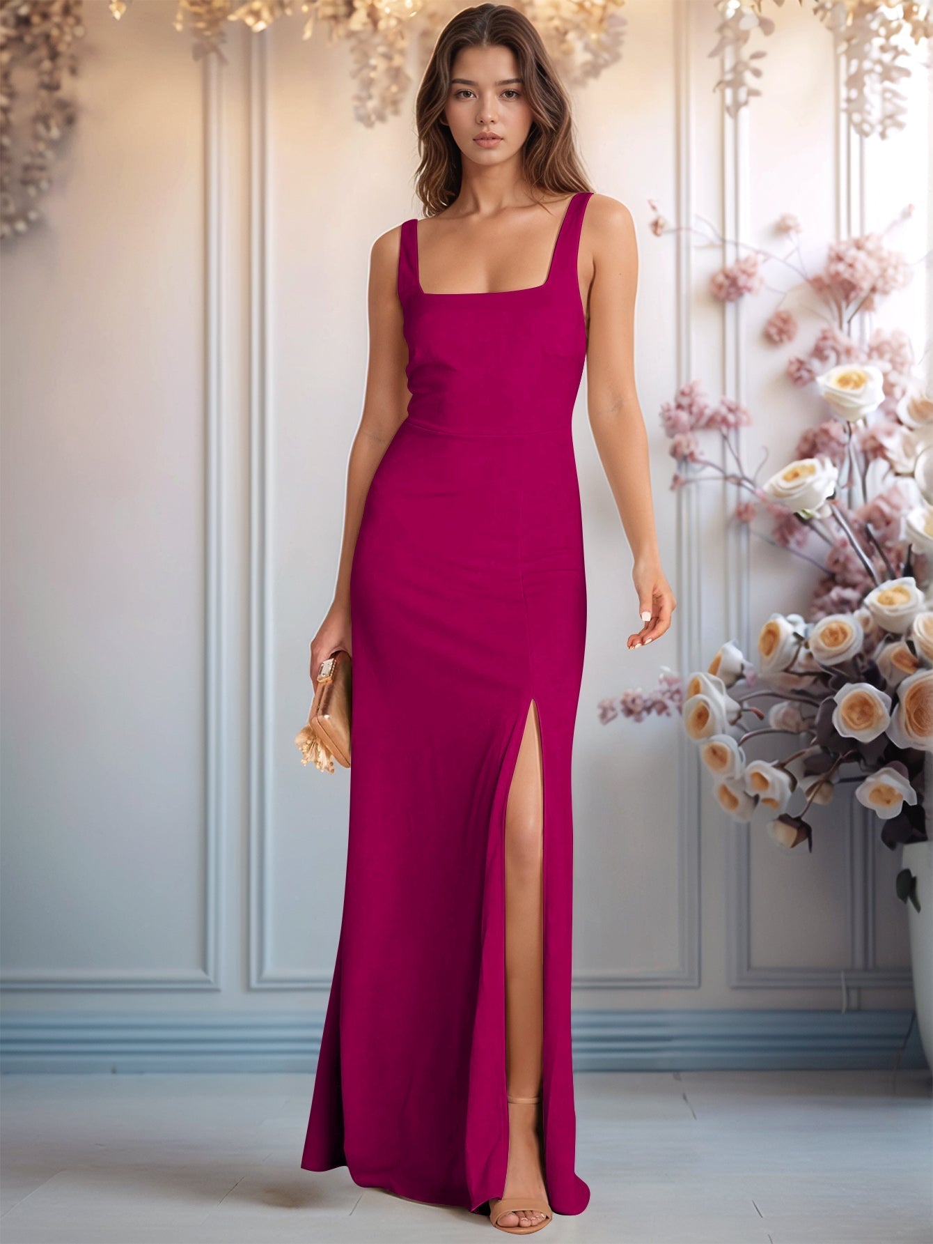 Square Sheath Floor Length Bridesmaid Dress With Split - Fuchsia