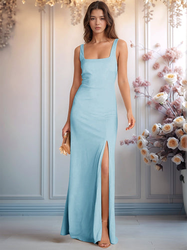 Square Sheath Floor Length Bridesmaid Dress With Split - Light Blue