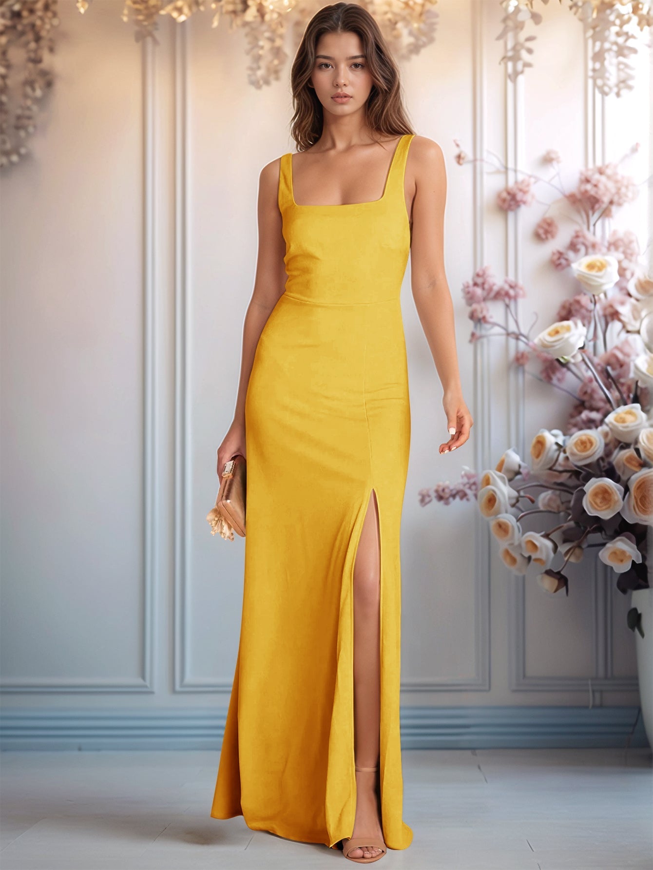 Square Sheath Floor Length Bridesmaid Dress With Split - Mustard Yellow