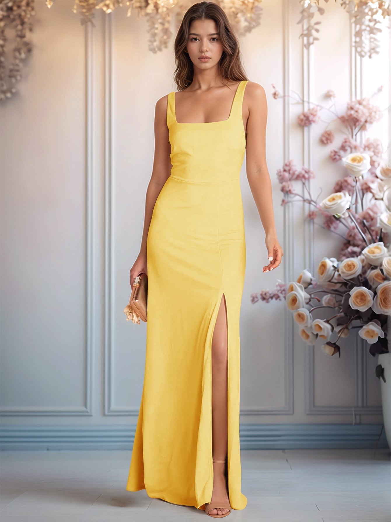Square Sheath Floor Length Bridesmaid Dress With Split - Yellow
