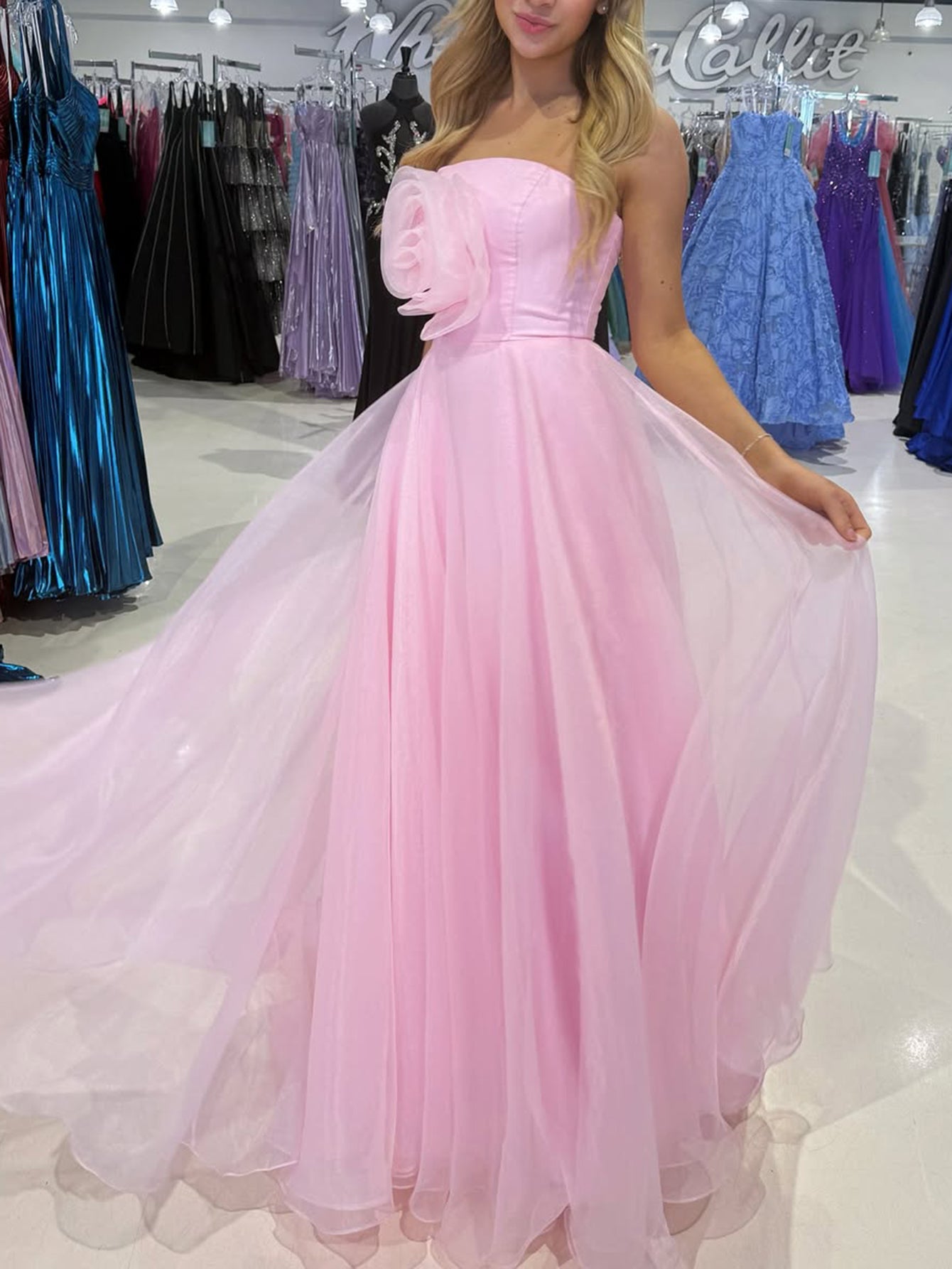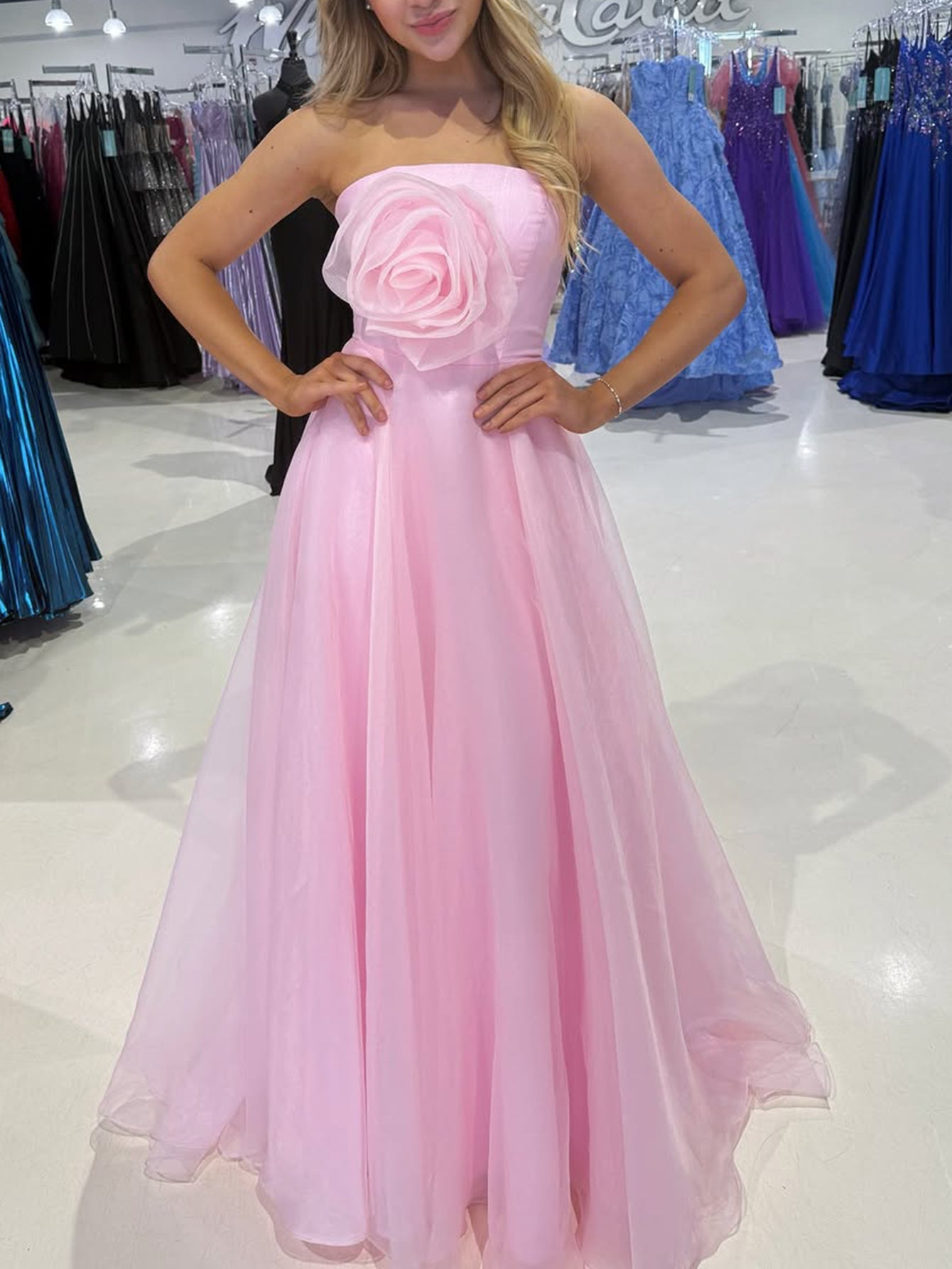 This tulle prom gown features 3d flower on the bodice. The strapless dress has a scoop neckline and pleated hem. Worldprom ball gown prom dresses are ideal for party, evening or festivals.