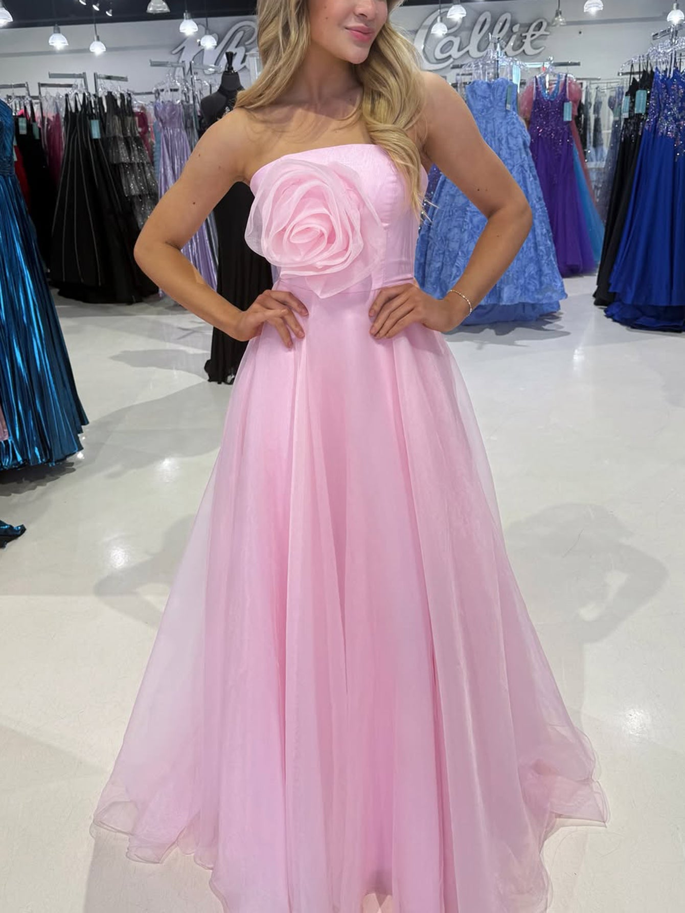 Strapless 3D Flower Bodice Long Ball Gown Prom Dress - Pink