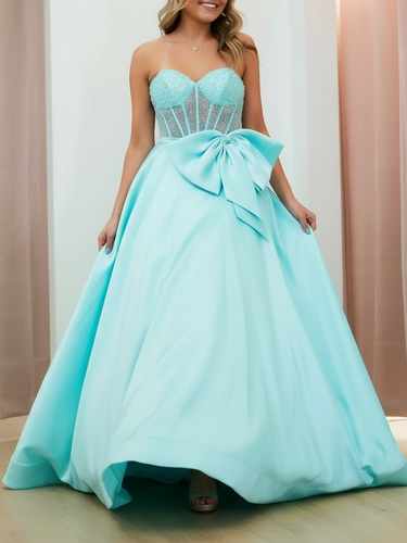 This satin prom gown features big bow with sheer on the illusion bodice. The strapless dress has a sweetheart neckline and pleated hem. Worldprom ball gown prom dresses are ideal for party, evening or festivals.