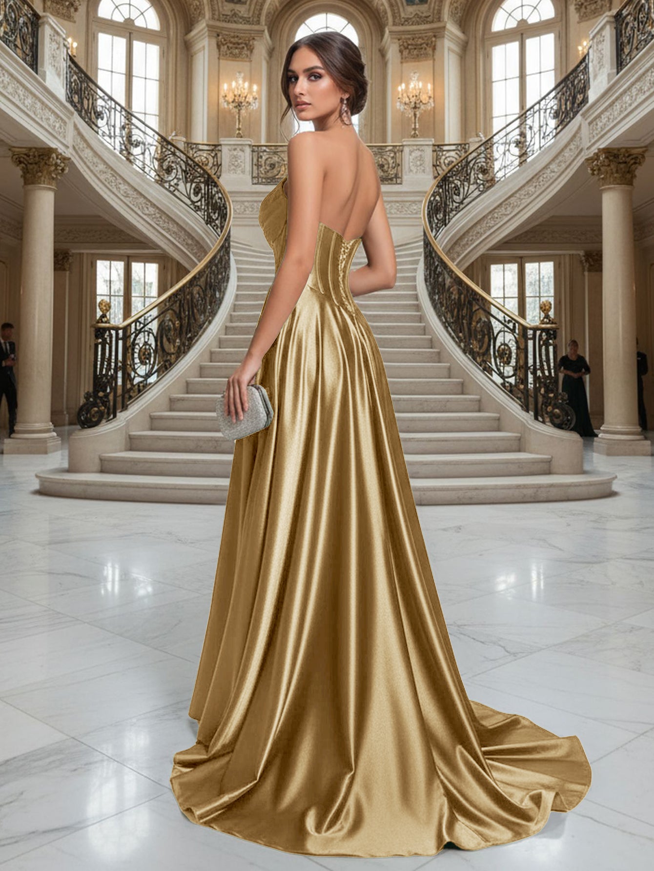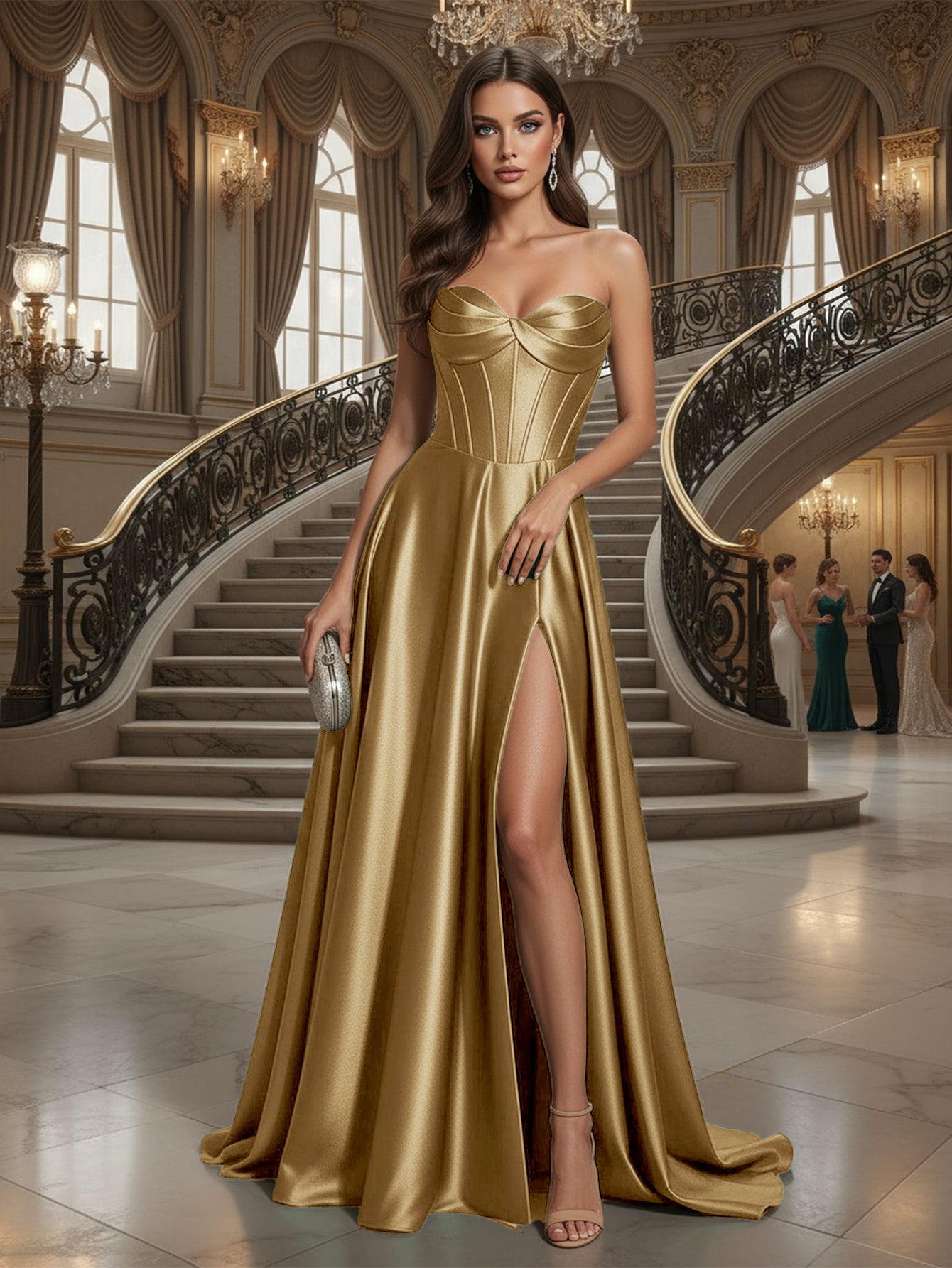 Strapless Bodice Split Prom Dress With Pocket - Gold