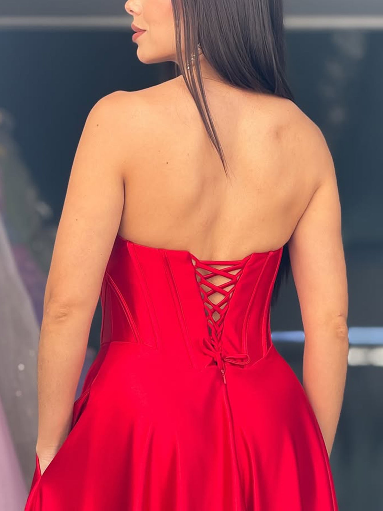 Strapless Bodice Split Prom Dress With Pocket - Red