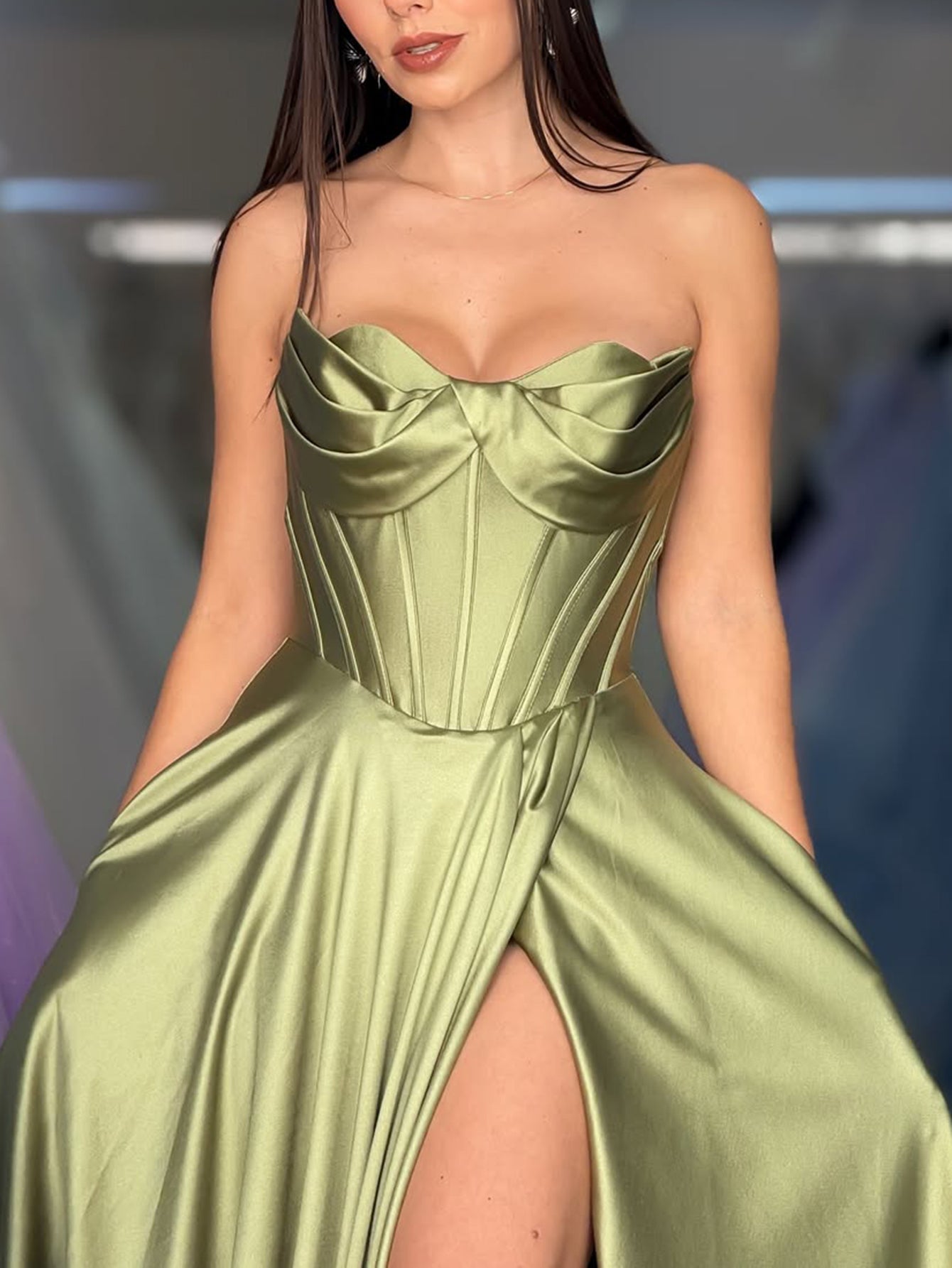 Strapless Bodice Split Prom Dress With Pocket - Sage Green