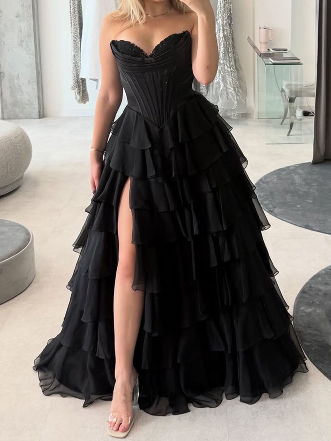 This chiffon prom dress features black chiffon and lace up on the bodice. The strapless dress for prom party has a sweetheart neck and ruffle hem. This fashion ball gown dress for cocktail is ideal for party, evening or festivals.