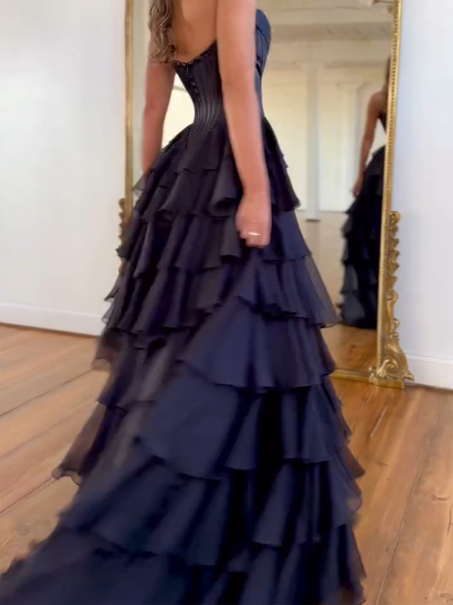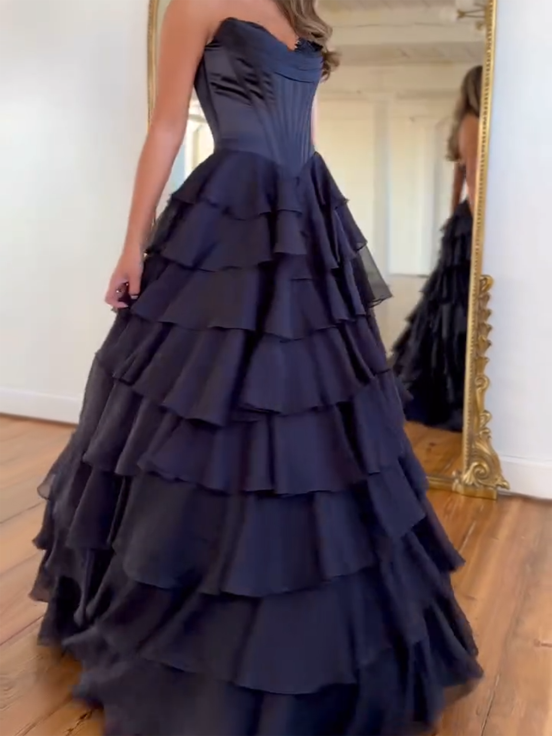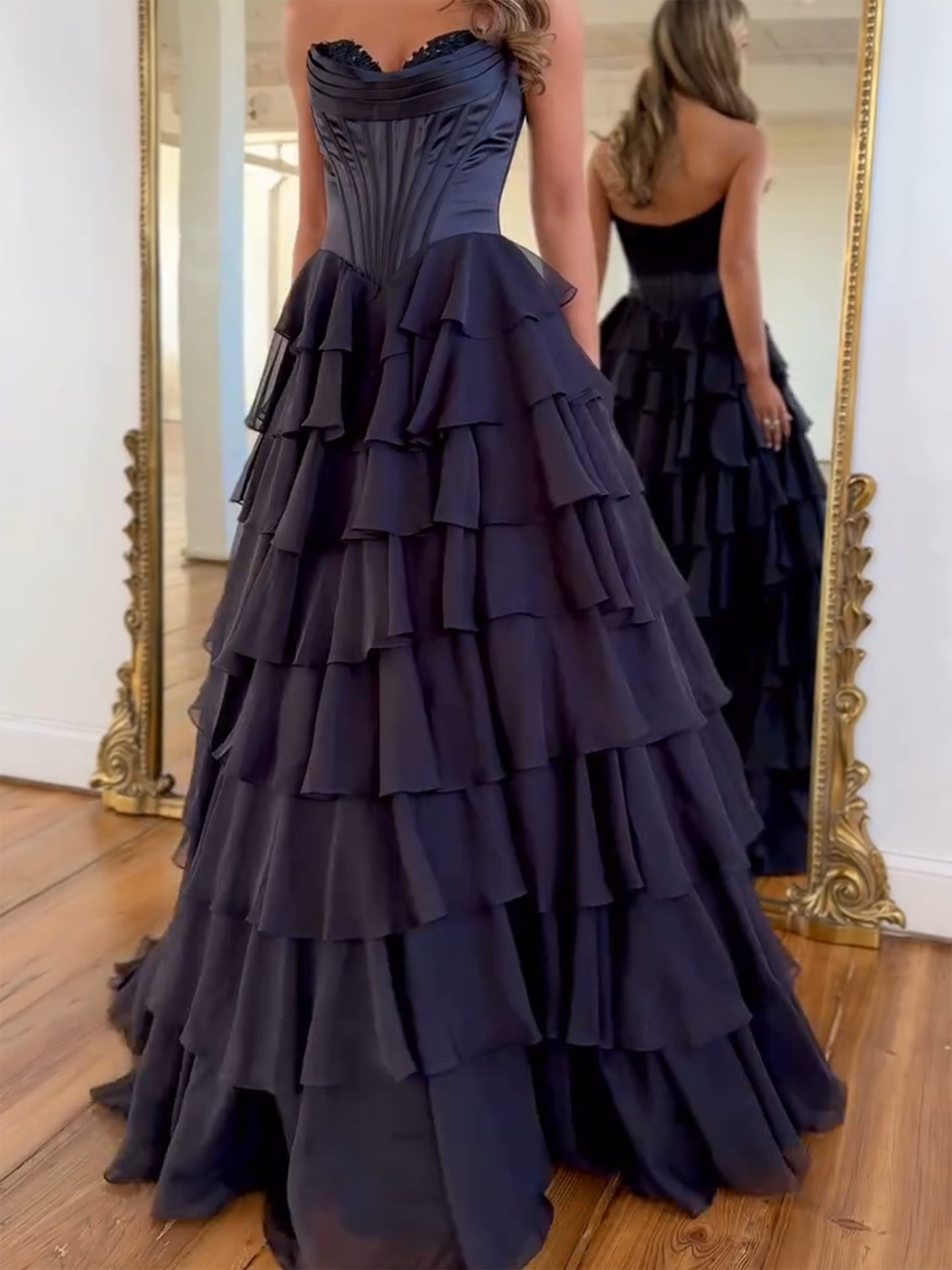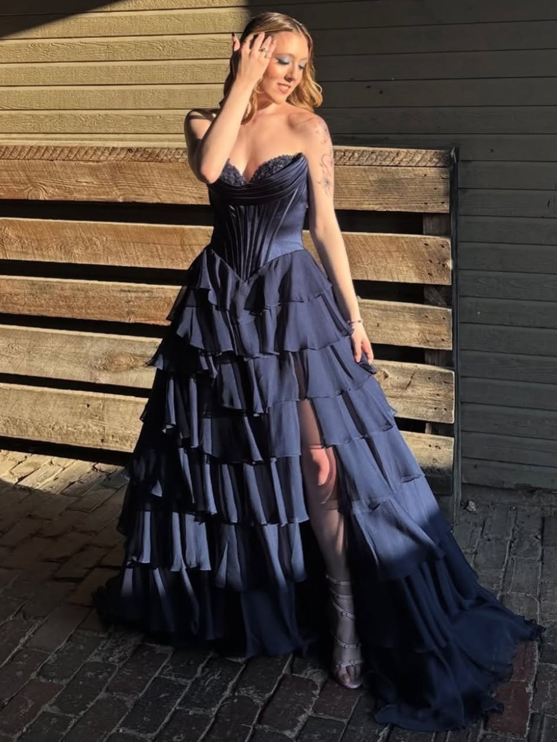 This chiffon prom dress features navy chiffon and lace up on the bodice. The strapless dress for prom party has a sweetheart neck and ruffle hem. This fashion ball gown dress for cocktail is ideal for party, evening or festivals.