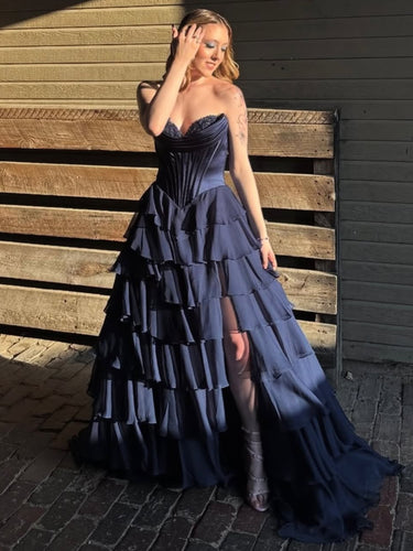 Strapless Boned Bodice Ruffle Chiffon Ball Gown Prom Dress - Navy Blue