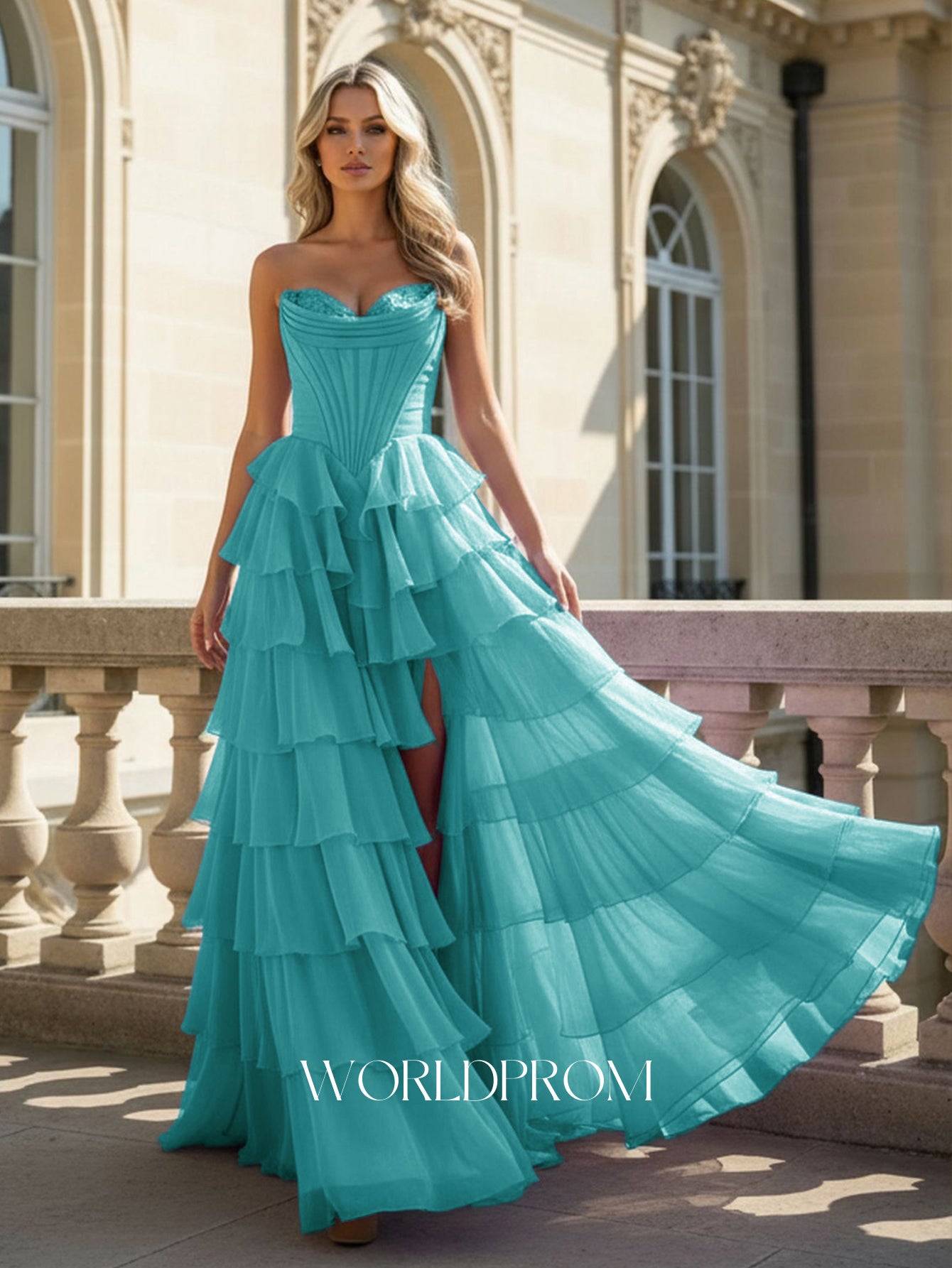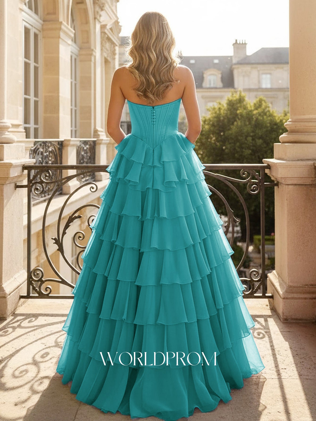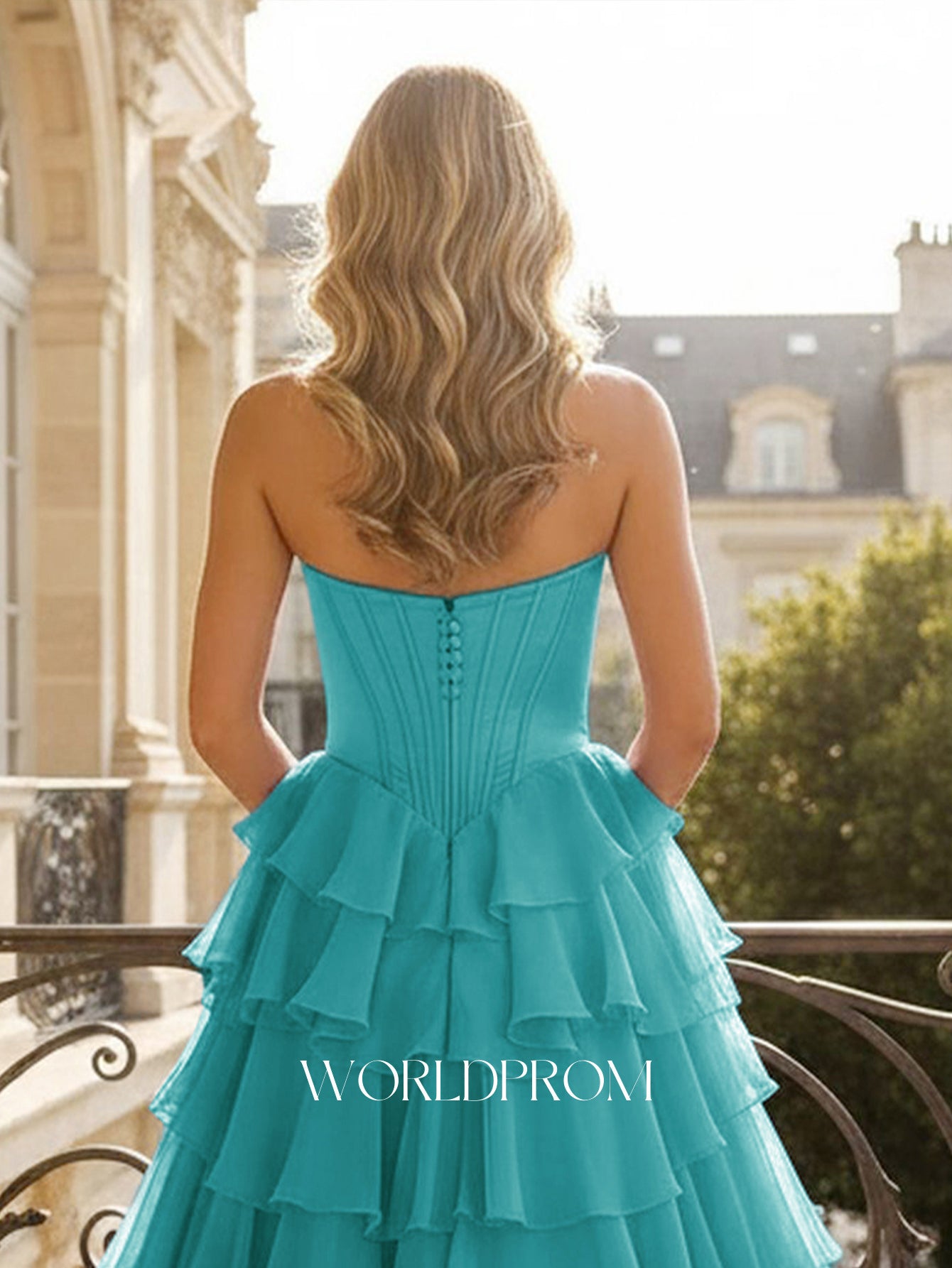 This chiffon prom dress features turquoise chiffon and lace up on the bodice. The strapless dress for prom party has a sweetheart neck and ruffle hem. This fashion ball gown dress for cocktail is ideal for party, evening or festivals.