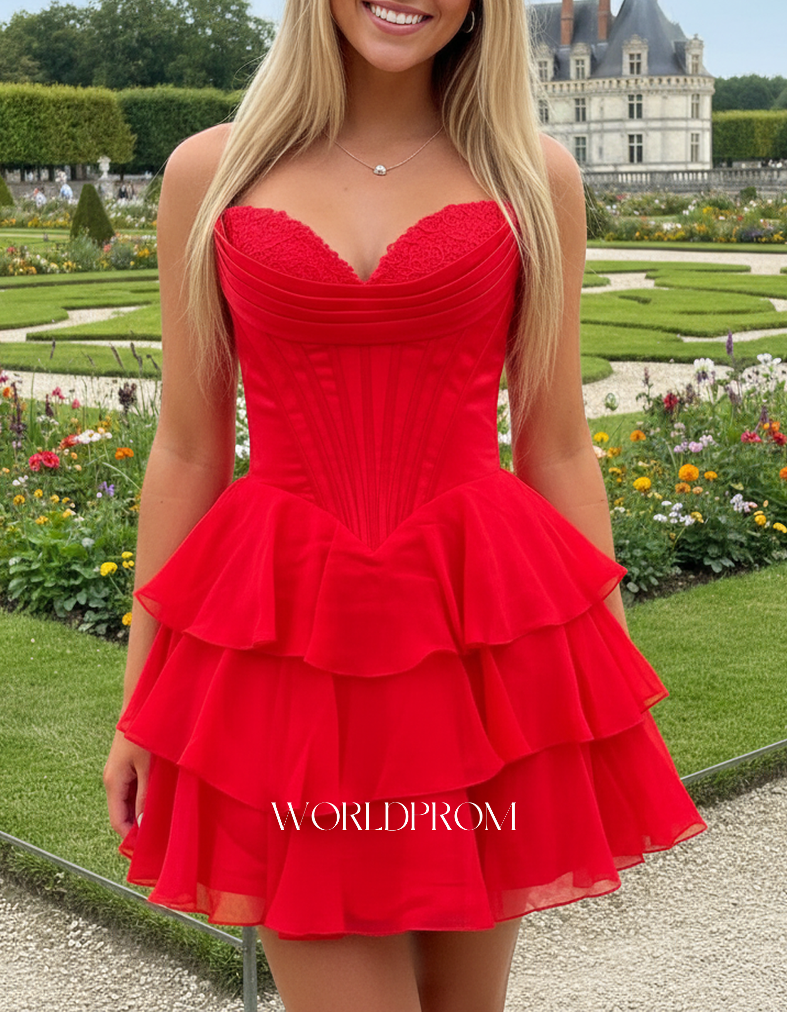 This chiffon short prom dress features boned on the bodice. The strapless mini dress has a sweetheart neck and ruffle layered hem. The sexy hoco dress is ideal for graduation party, homecoming or prom party.