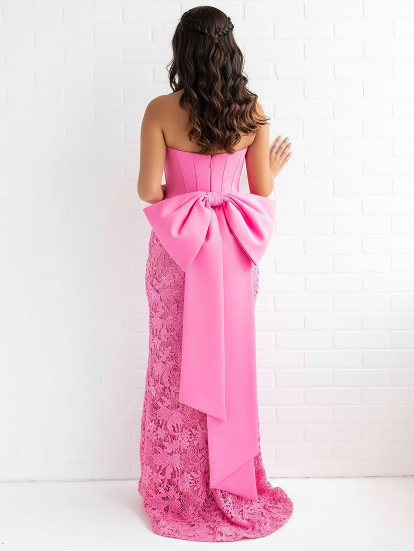 Strapless Bow Back Ruched Beading Floral Bodice Mermaid Prom Dress With Slit - Pink