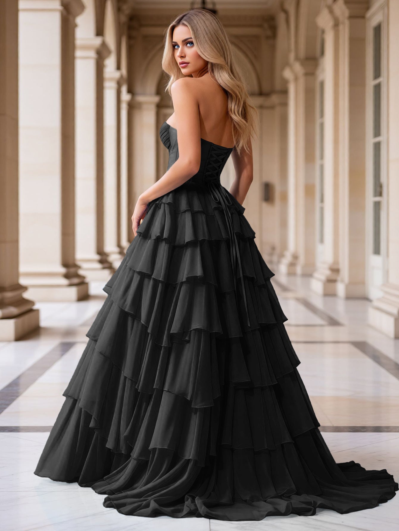 Strapless Corset Ball Gown With Ruffle Skirt Slit - Black