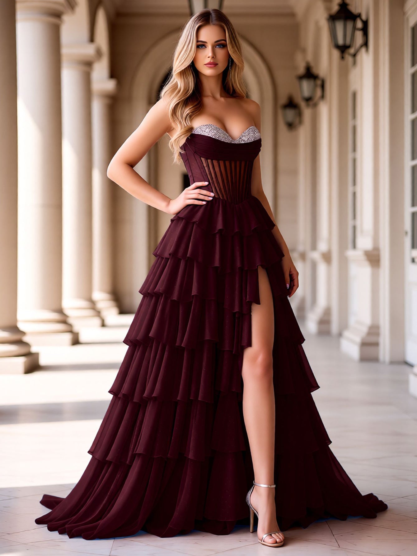Details: Backless, Fitted Waist, Split, Ruched Bust, Bodice, Corset, Ruffle, Crystal