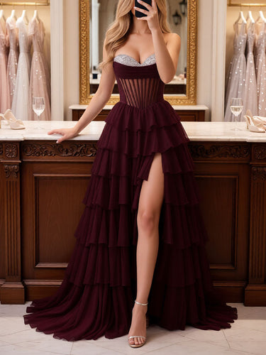 Strapless Corset Ball Gown With Ruffle Skirt Slit - Burgundy