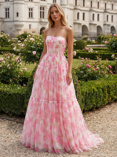 Strapless Floral Bodice Lace Up Layered Long Ball Gown Prom Dress in Pink Floral