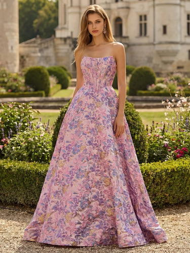 Strapless Floral Bodice Lace Up Long Ball Gown Prom Dress in Pink Floral