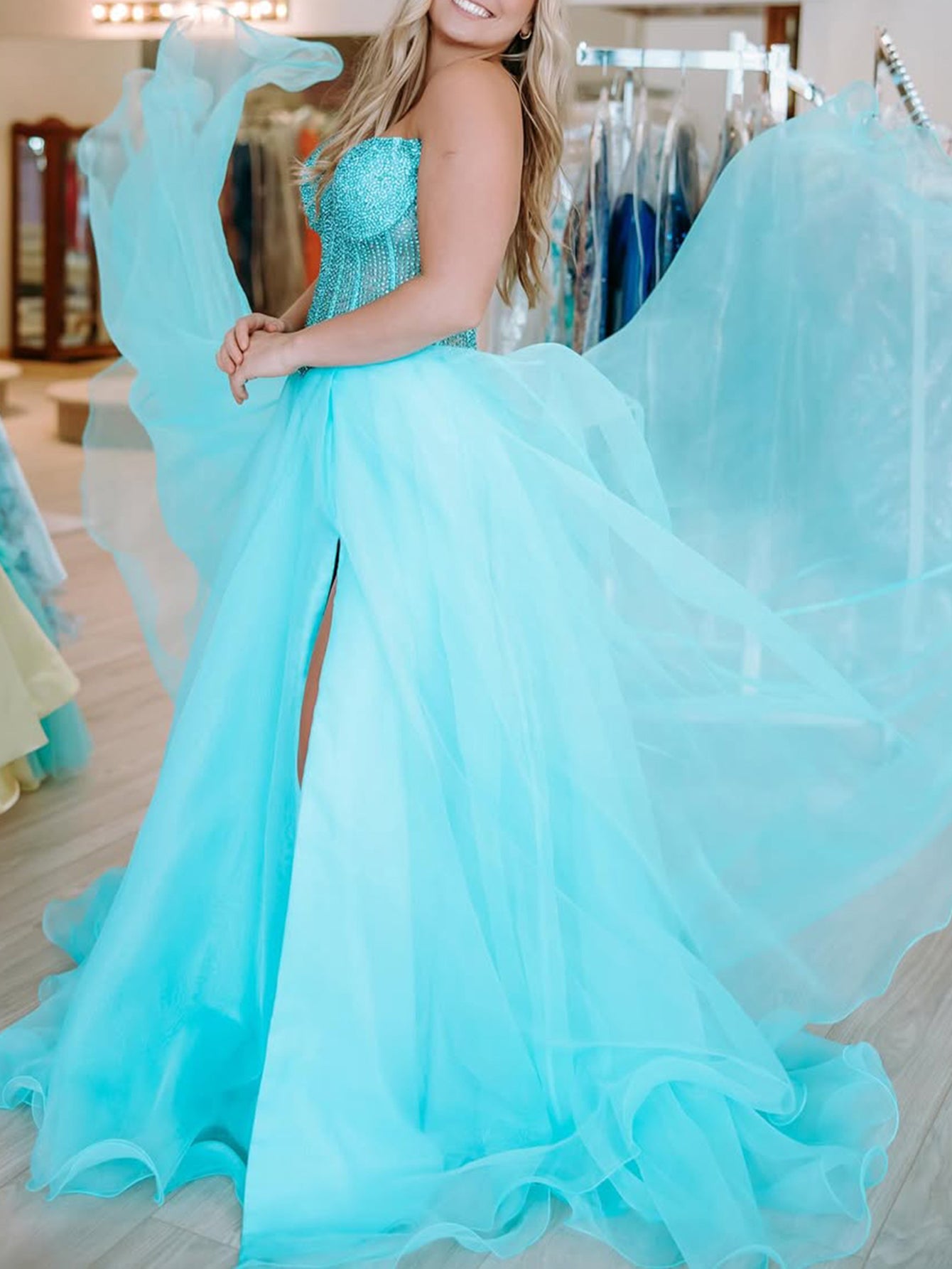 Strapless Hand Beading Bodice Ball Gown Prom Dress With Slit - Blue