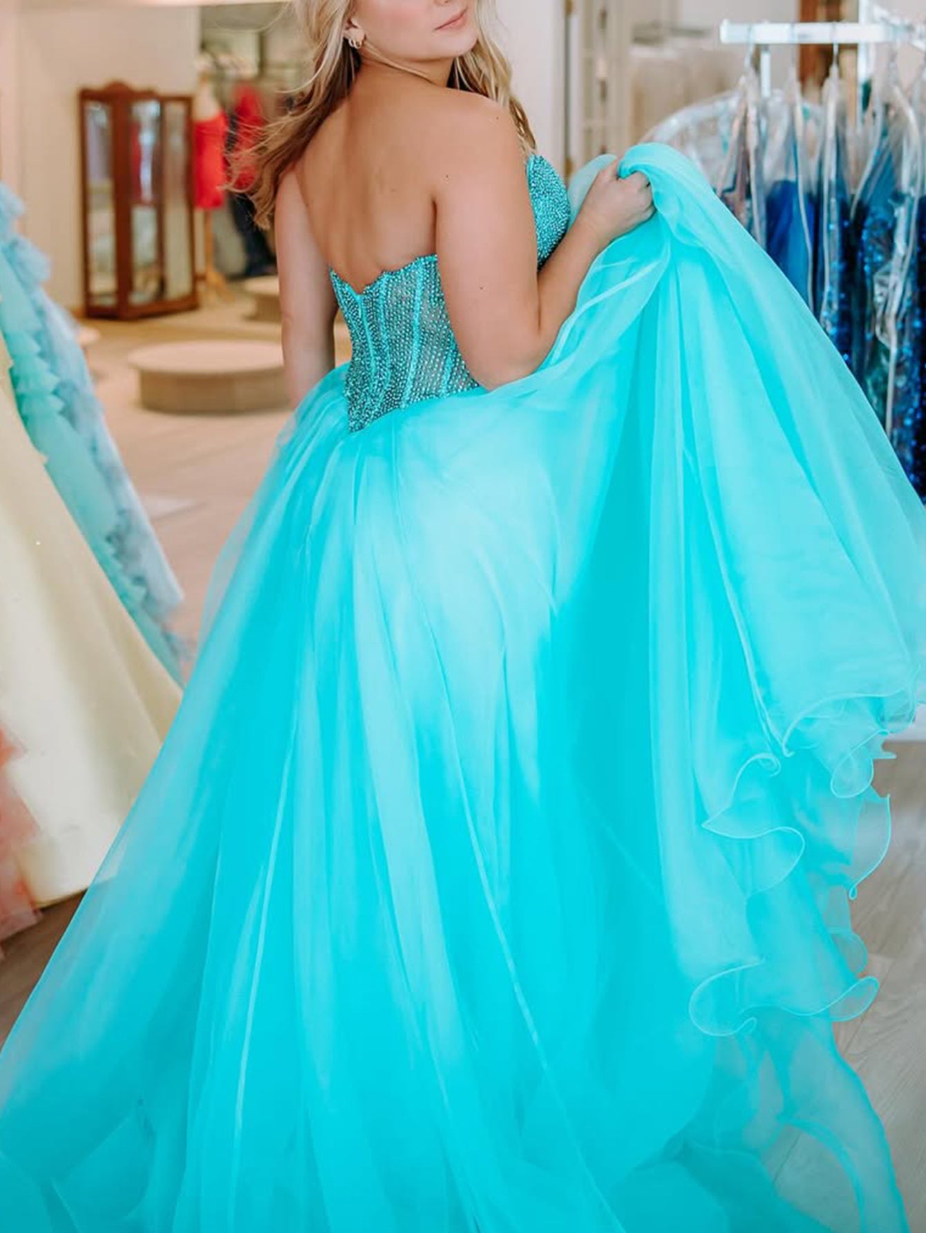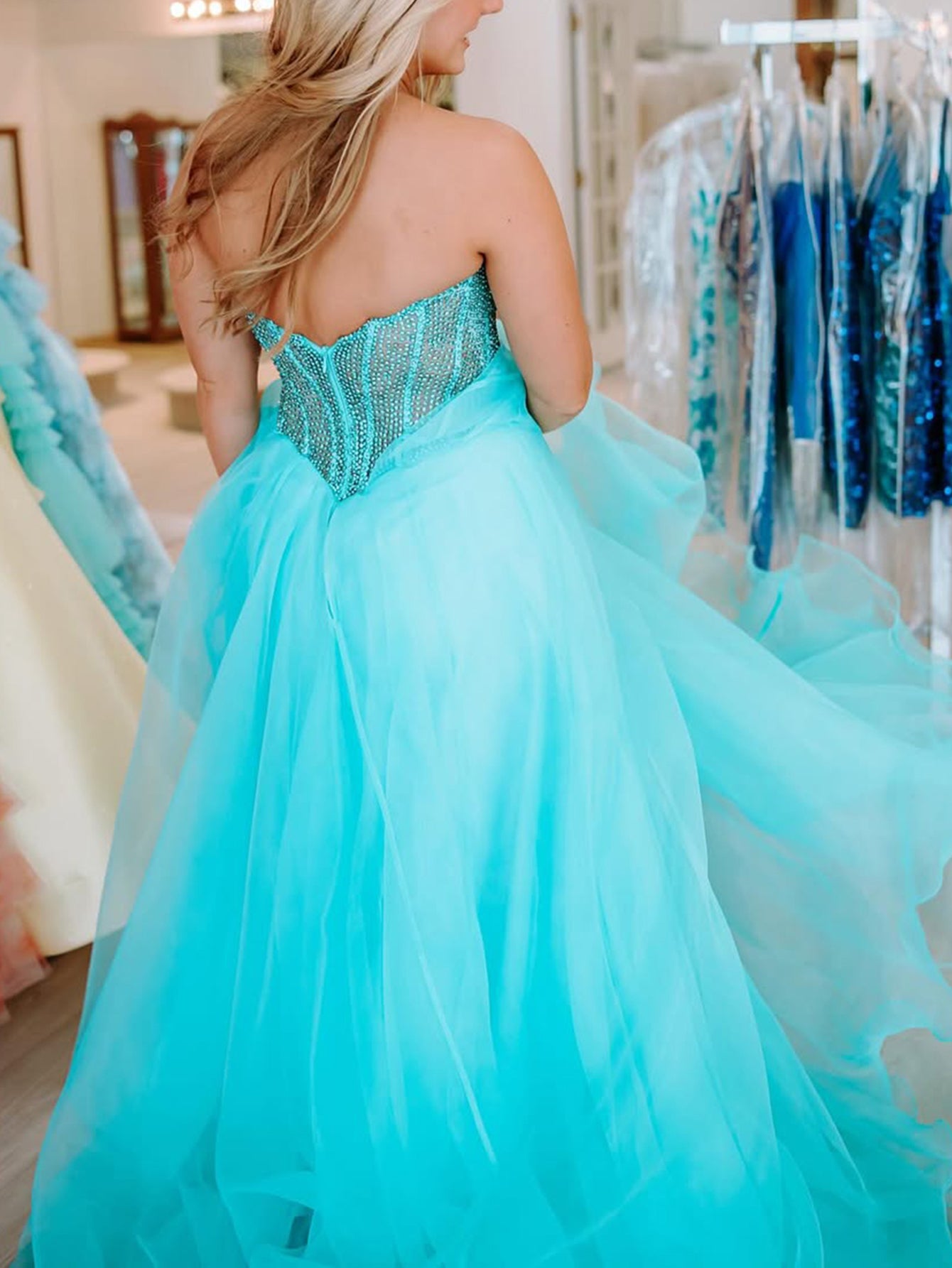 This Tulle prom gown features sparkly beading on the illusion bodice. The strapless dress has a sweetheart neckline and split hem. Worldprom mermaid prom dresses are ideal for party, evening or festivals.