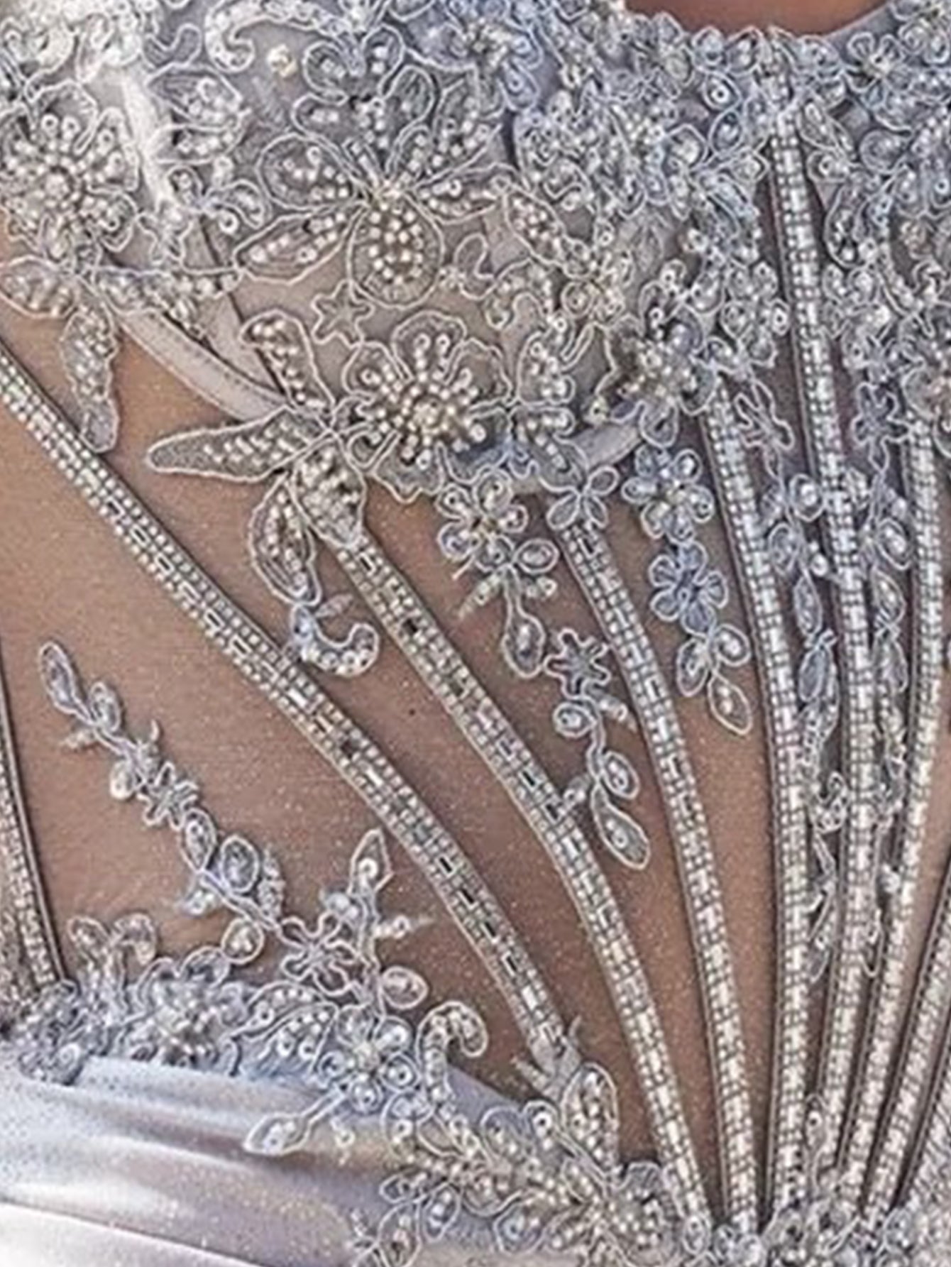 Strapless Hand Beading Lace Up Ruched Illusion Bodice Mermaid Prom Dress With Slit - Grey