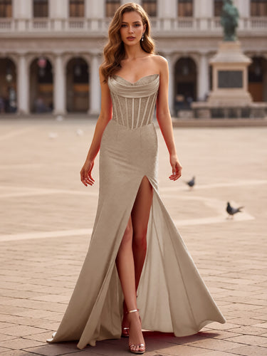 This satin prom gown features hot fix crystal on the bodice. The strapless dress has a V-neckline and split hem. Worldprom mermaid prom dresses are ideal for party, evening or festivals.