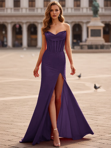 Strapless Hot Fix Crystal Corset Ruched Bust Lace Up Long Prom Dress With Slit - Purple