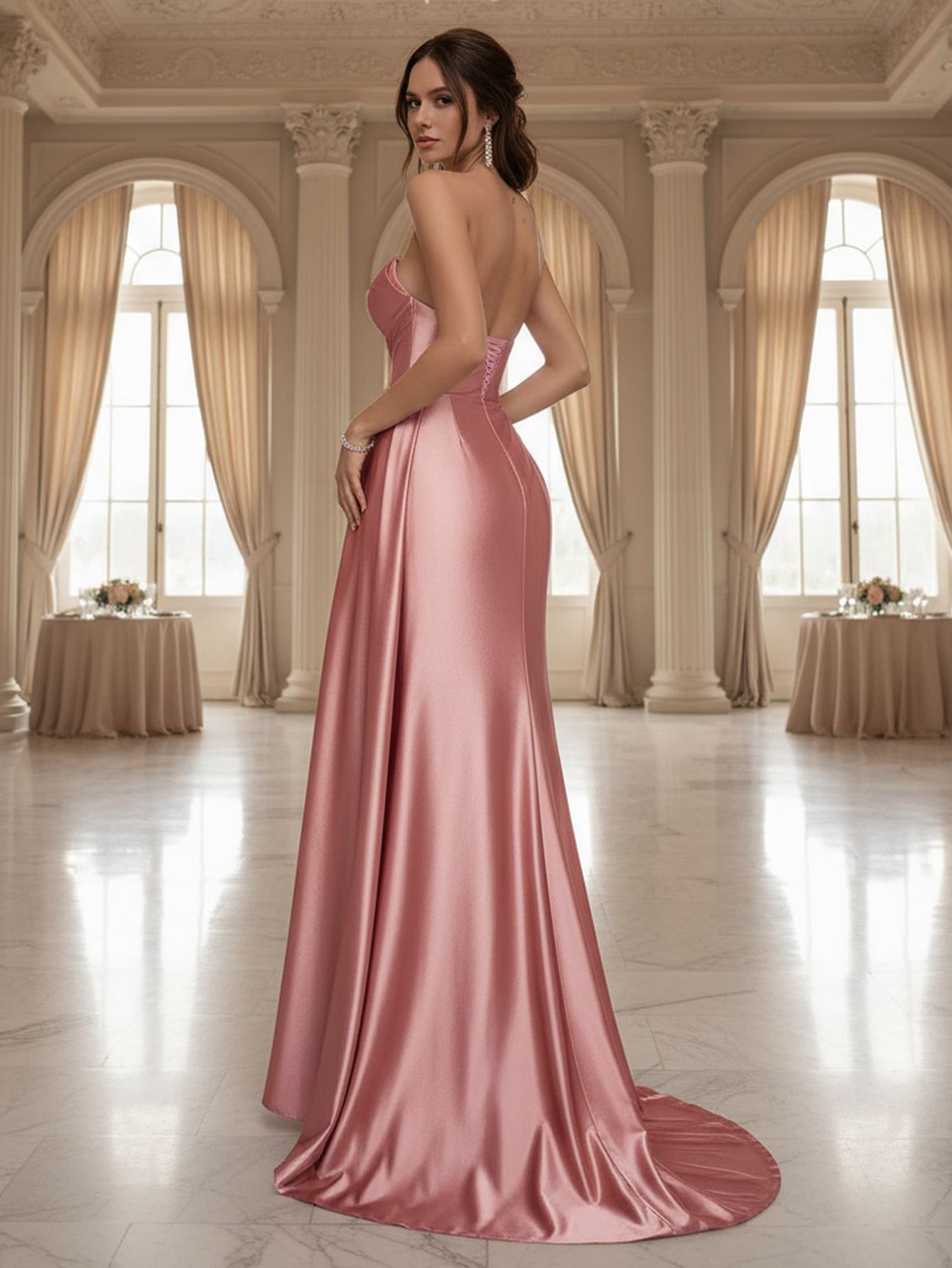 Strapless Lace Up Ruched Bodice Mermaid Prom Dress With Drop - Rose Gold