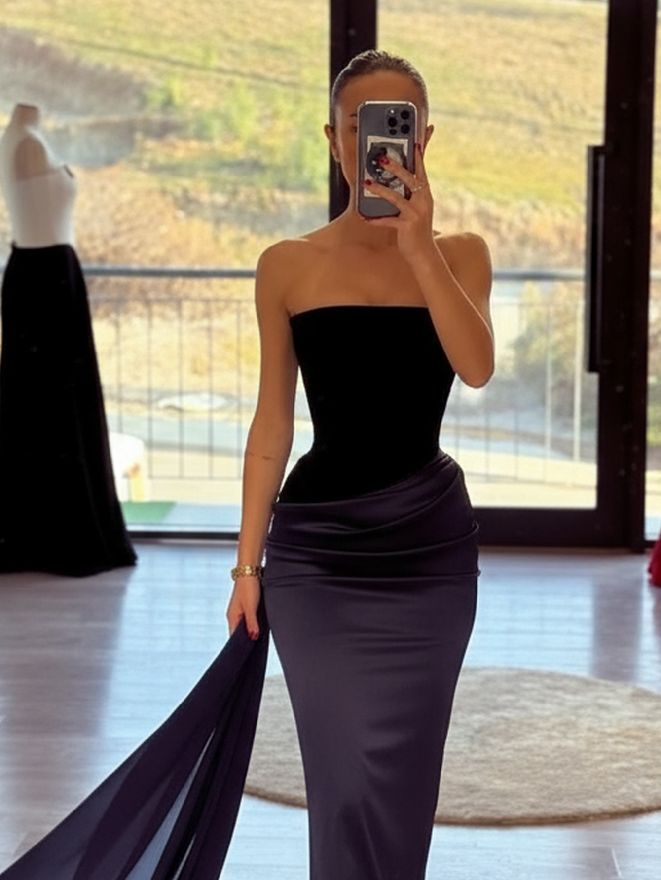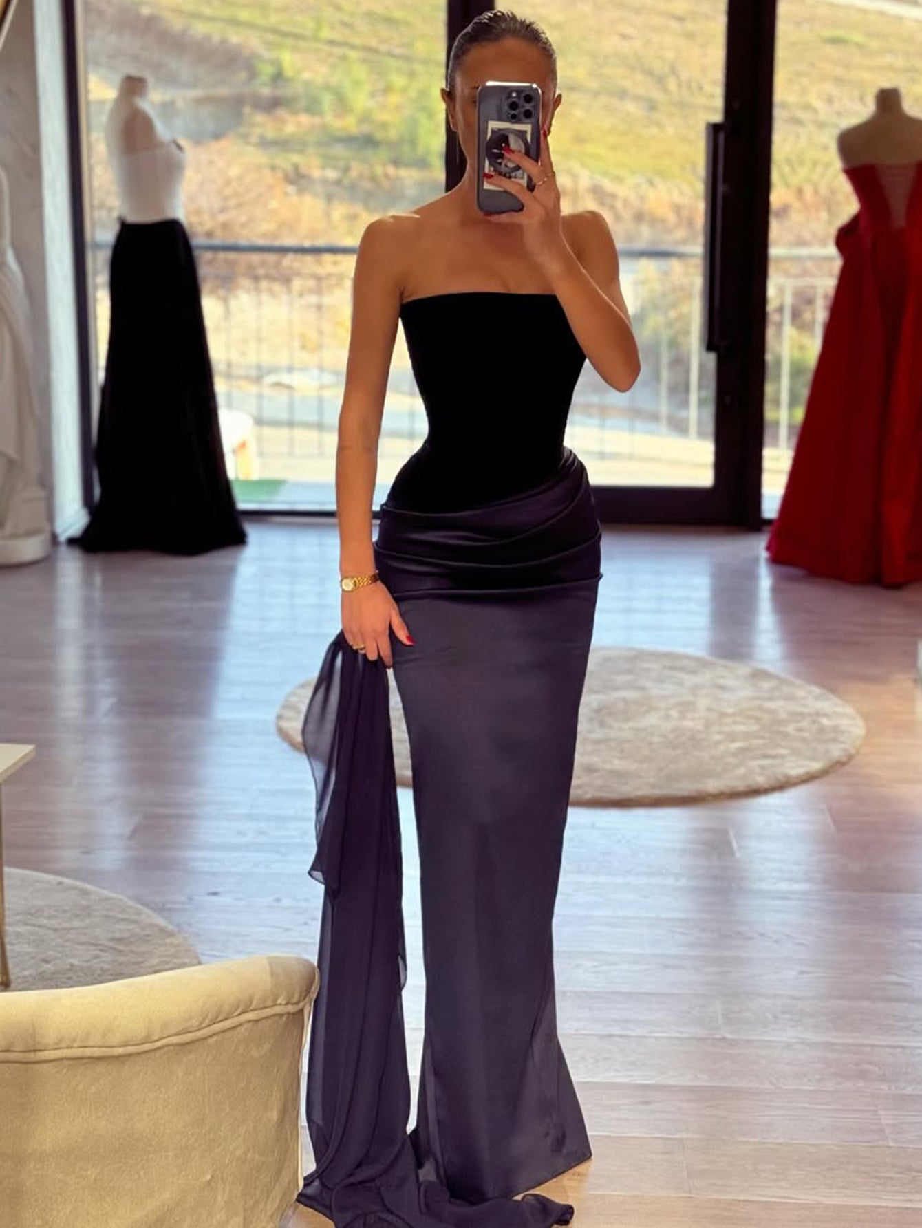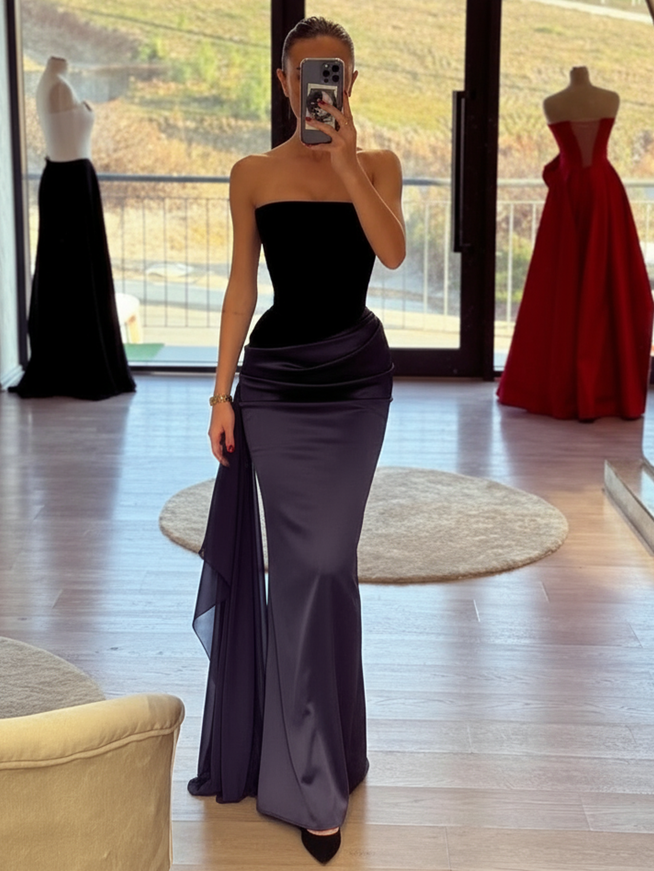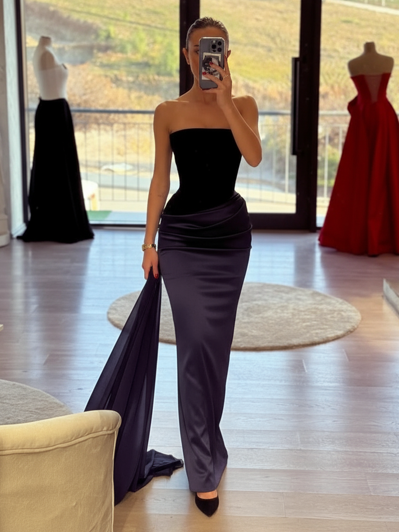 This satin prom gown features corset with shawl on the bodice. The strapless dress has a scoop neckline and sheath hem. Worldprom mermaid prom dresses are ideal for party, evening or festivals.