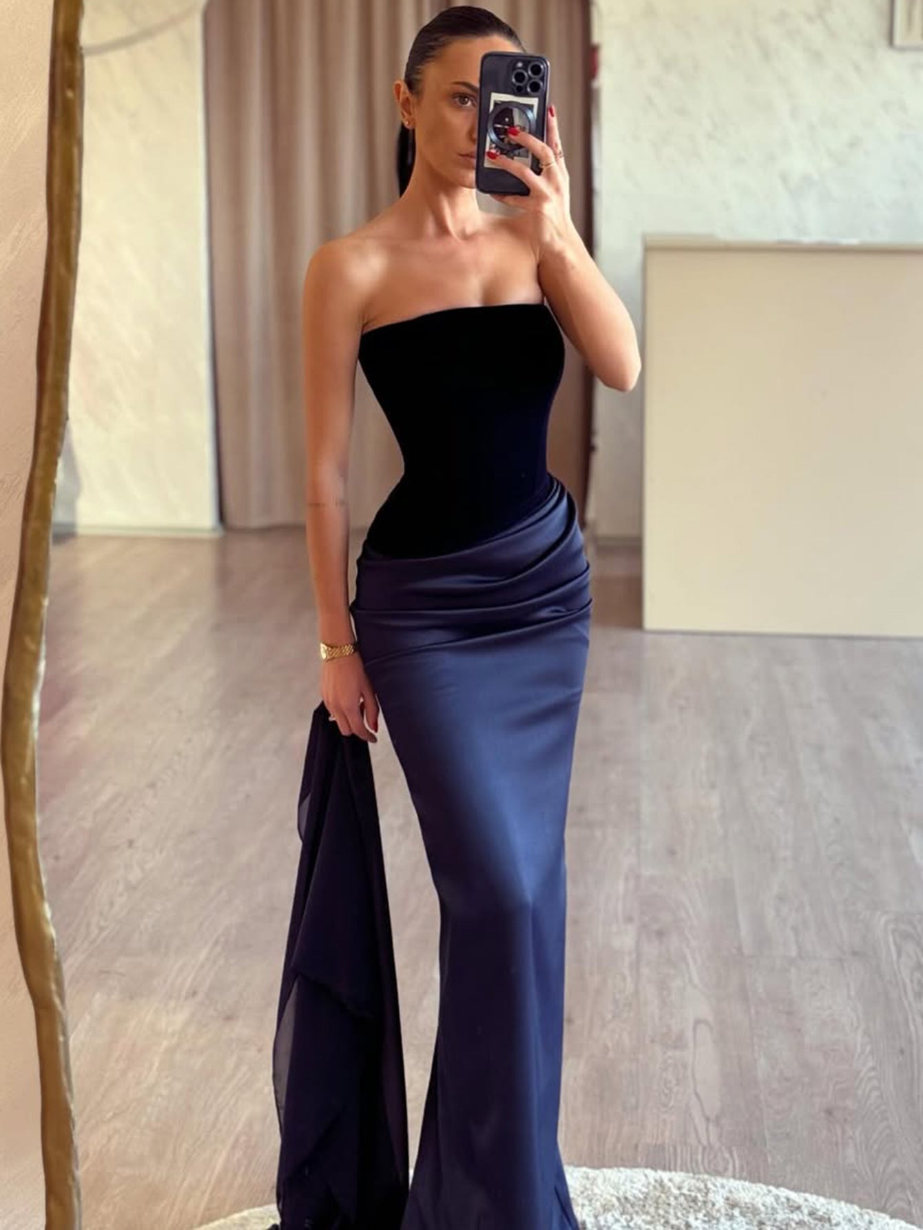 Strapless Ruched Bodice Long Mermaid Prom Dress With Shawl - Navy Blue