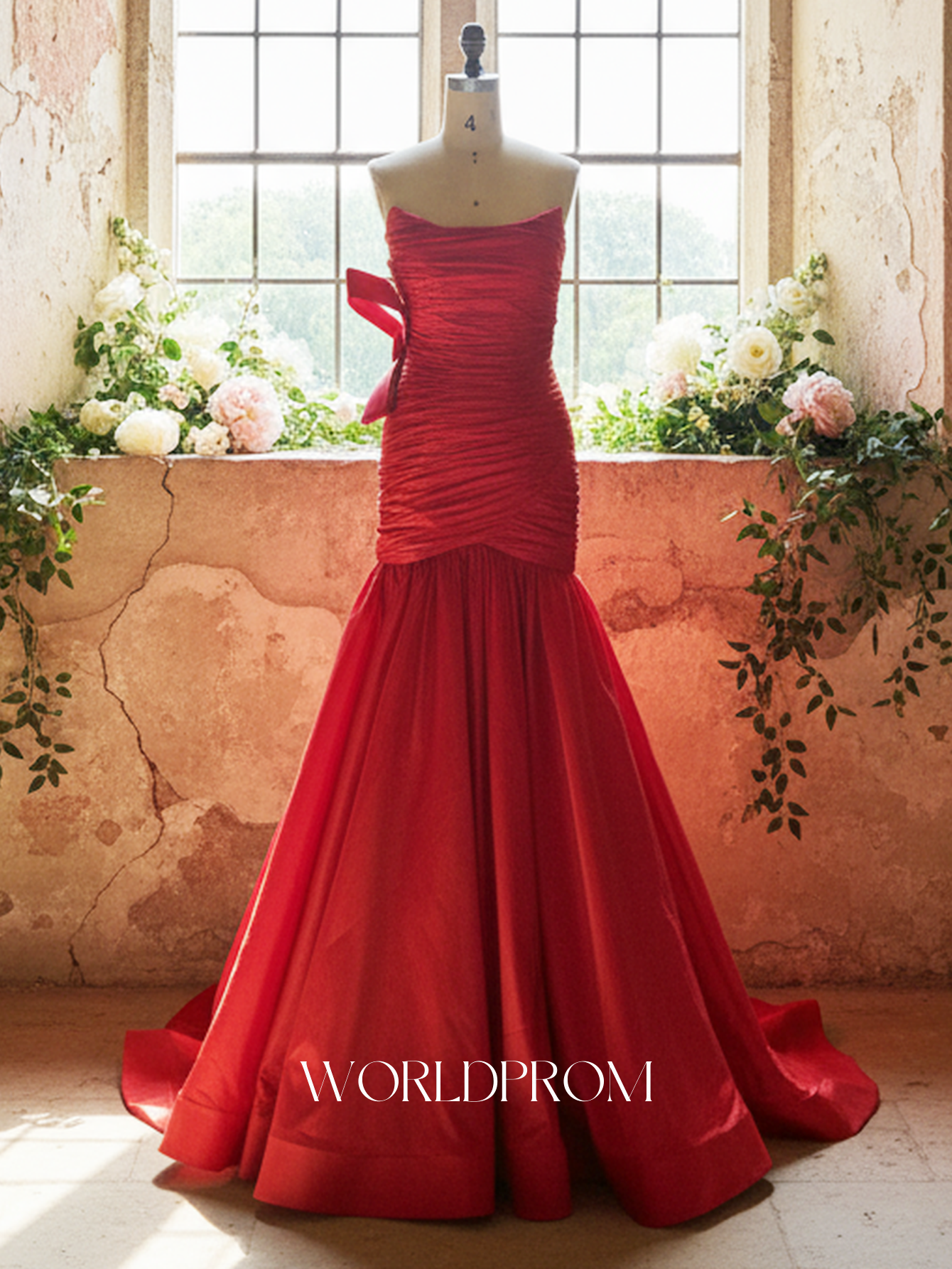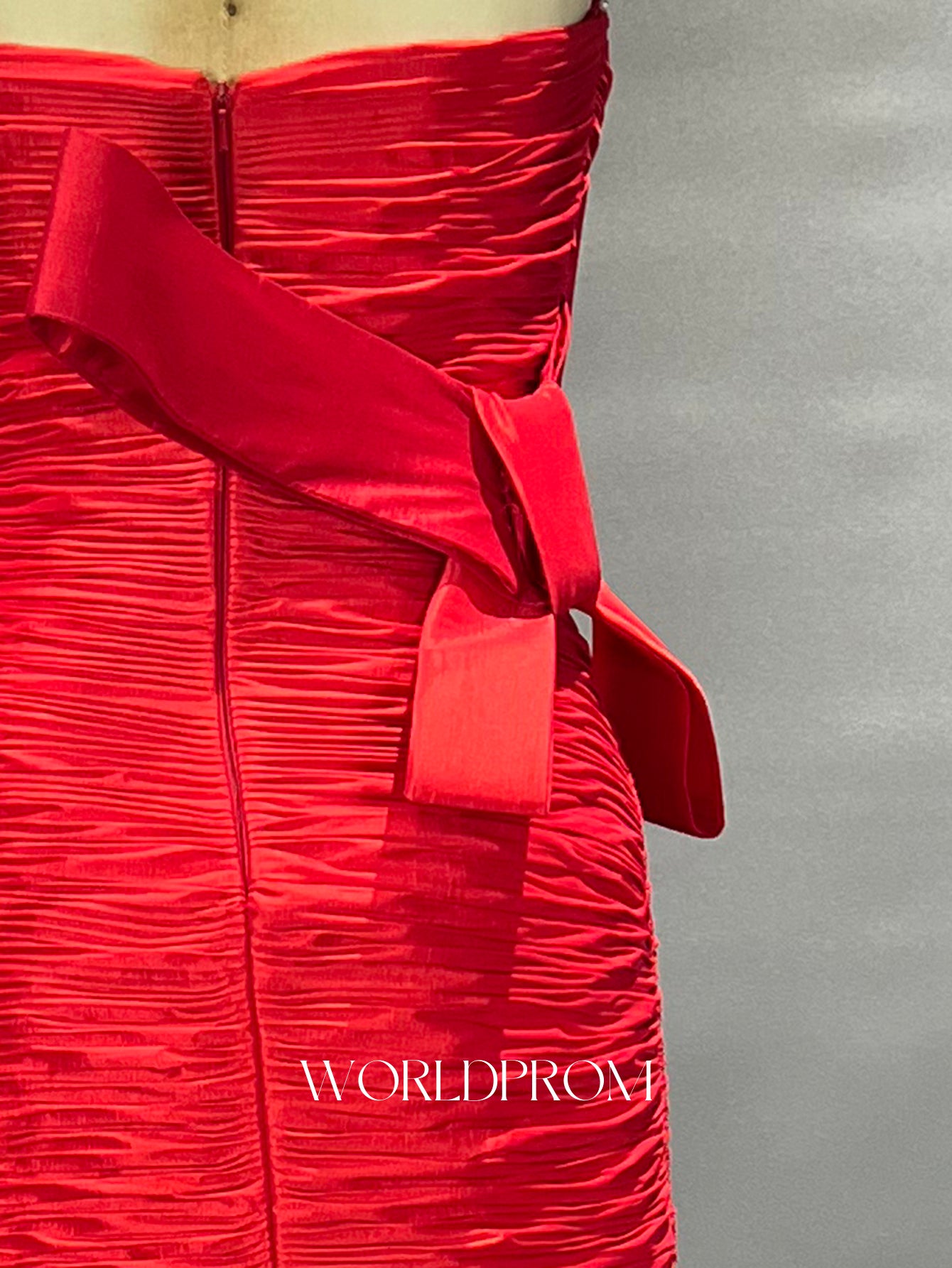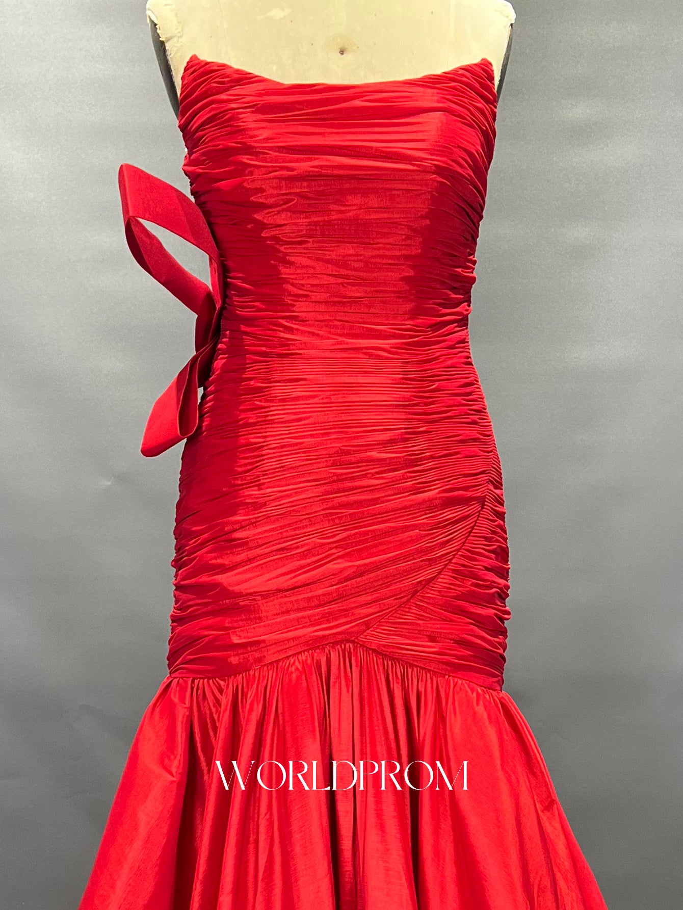 This prom gown features pleated with big bow on the bodice. The strapless dress has a scoop neckline and ruched hem. Worldprom ball gown prom dresses are ideal for party, evening or festivals.