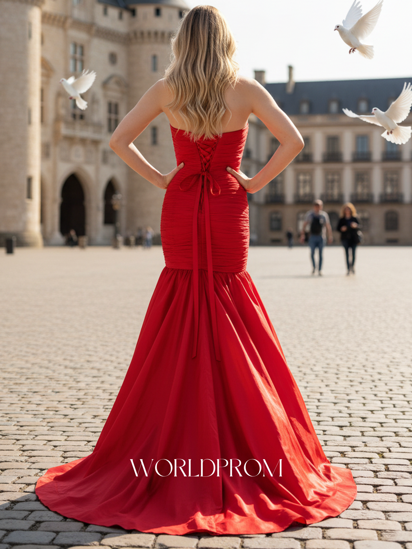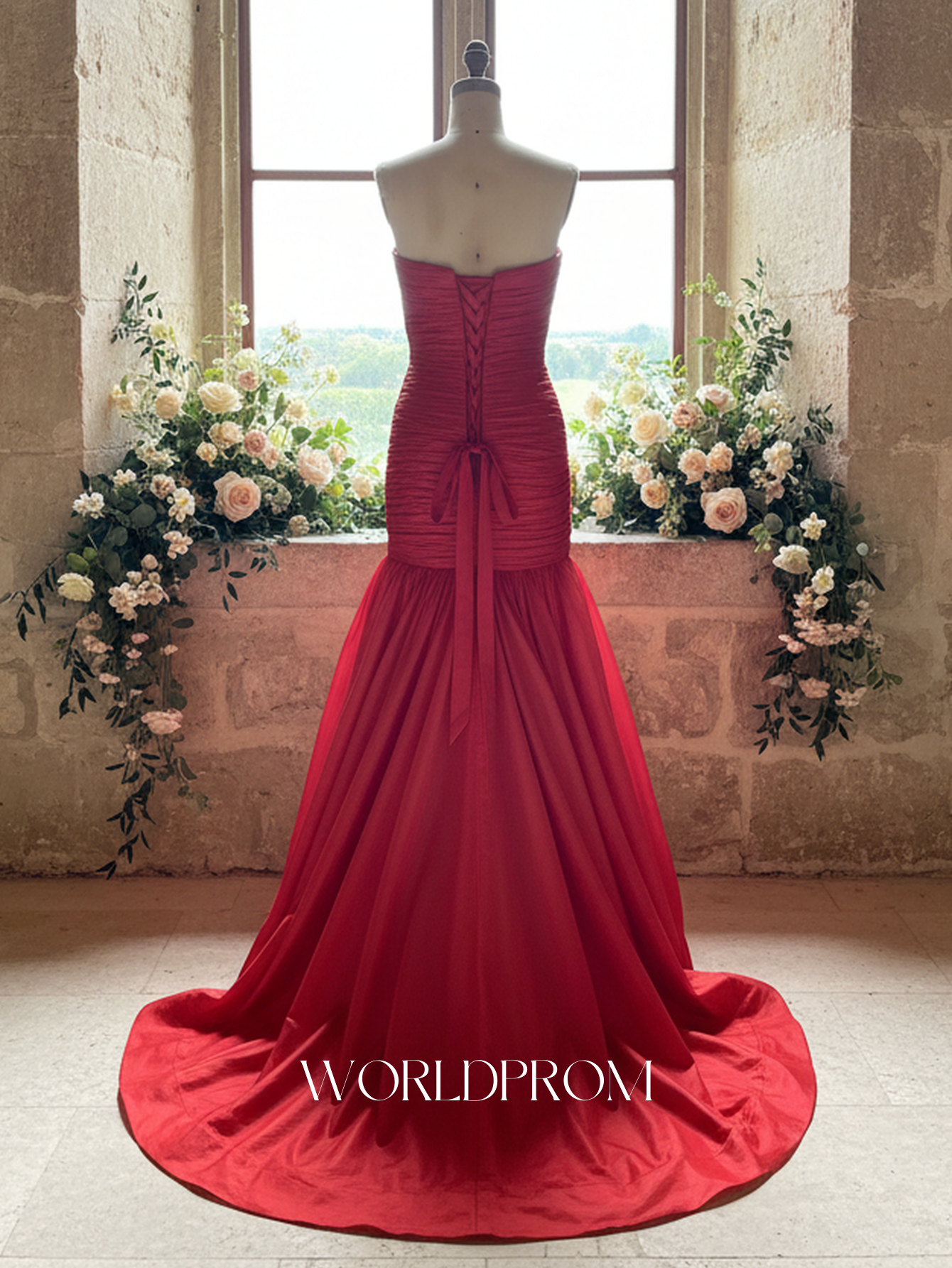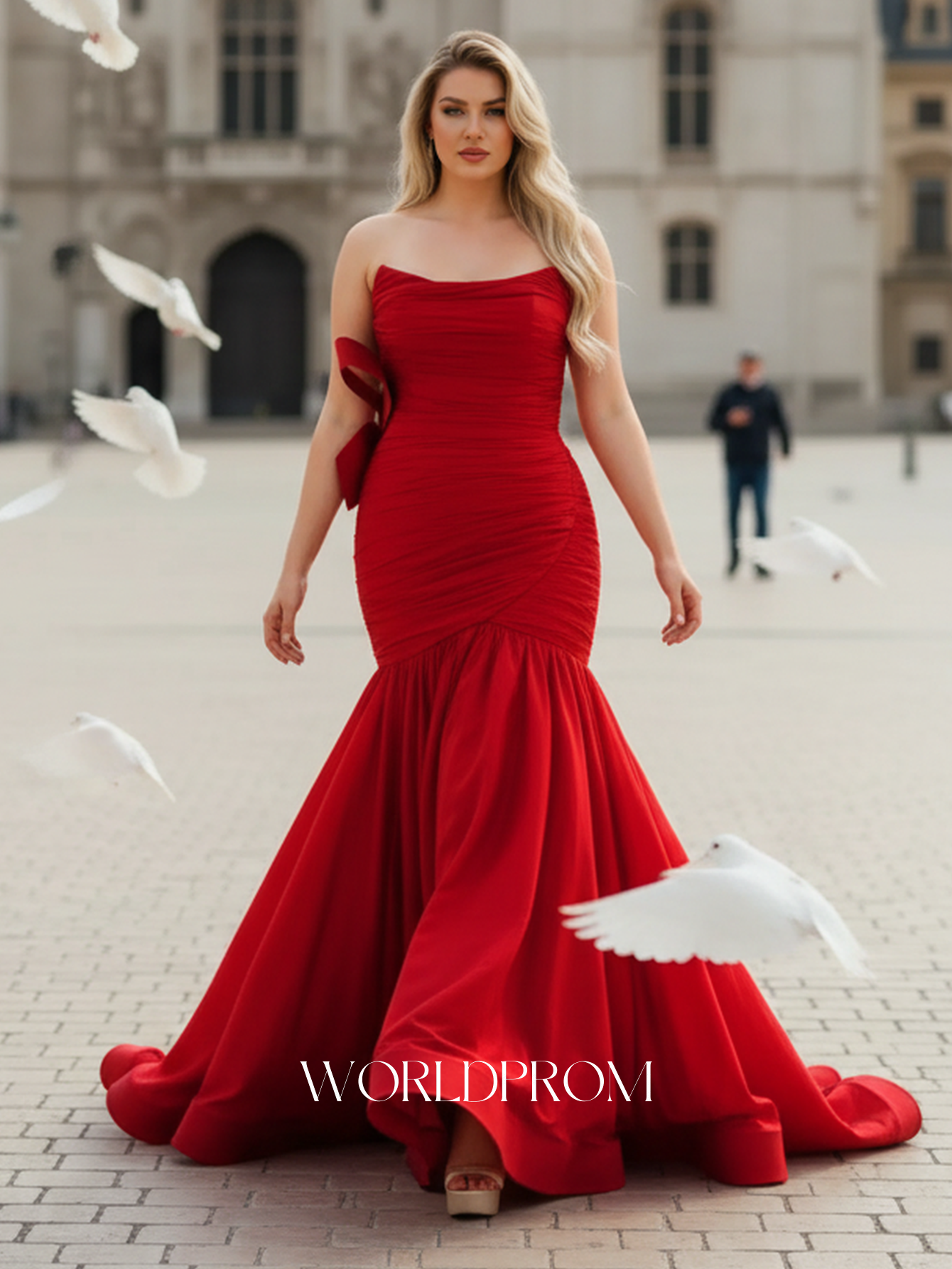 This prom gown features pleated with big bow on the bodice. The strapless dress has a scoop neckline and ruched hem. Worldprom ball gown prom dresses are ideal for party, evening or festivals.