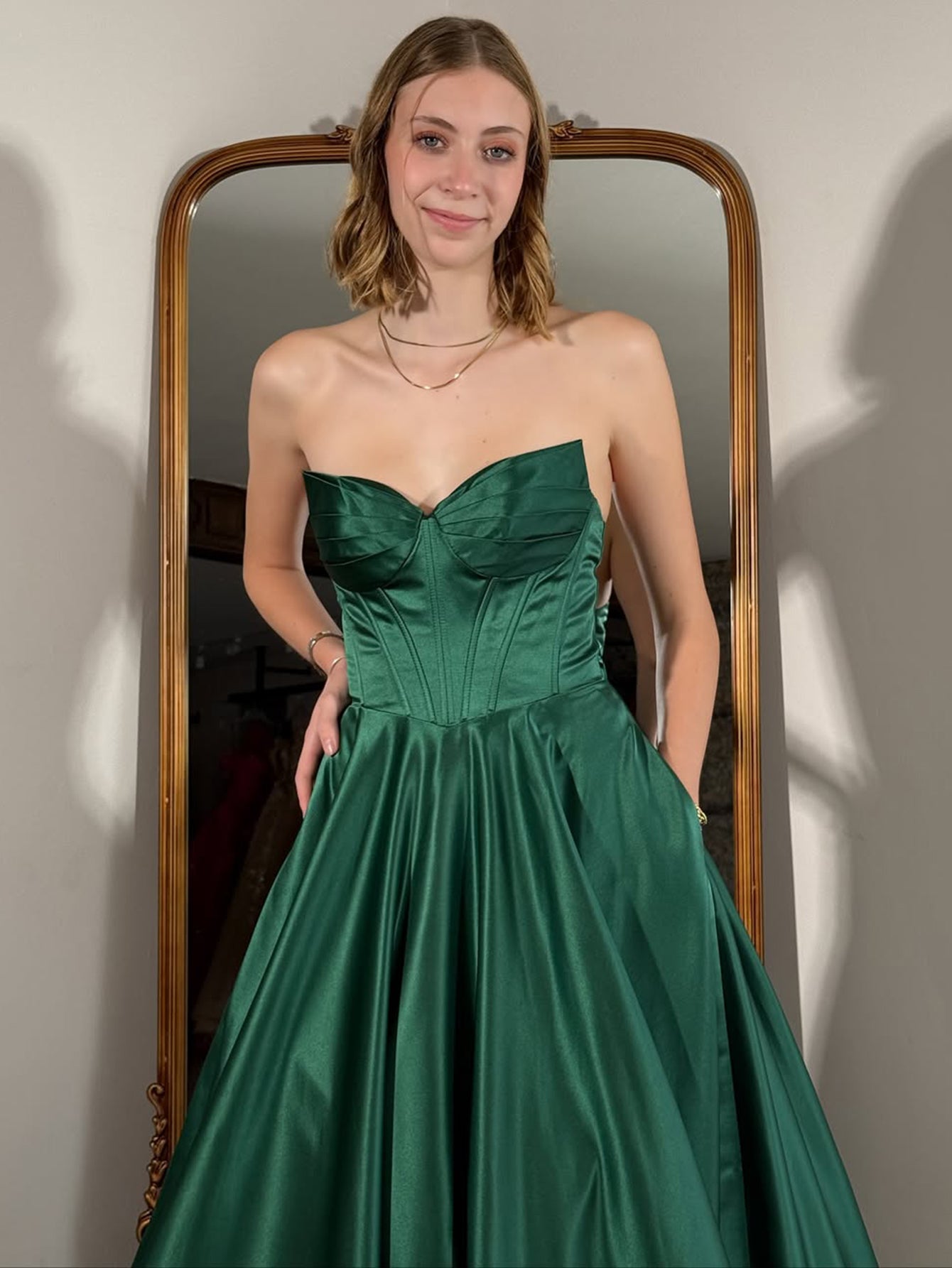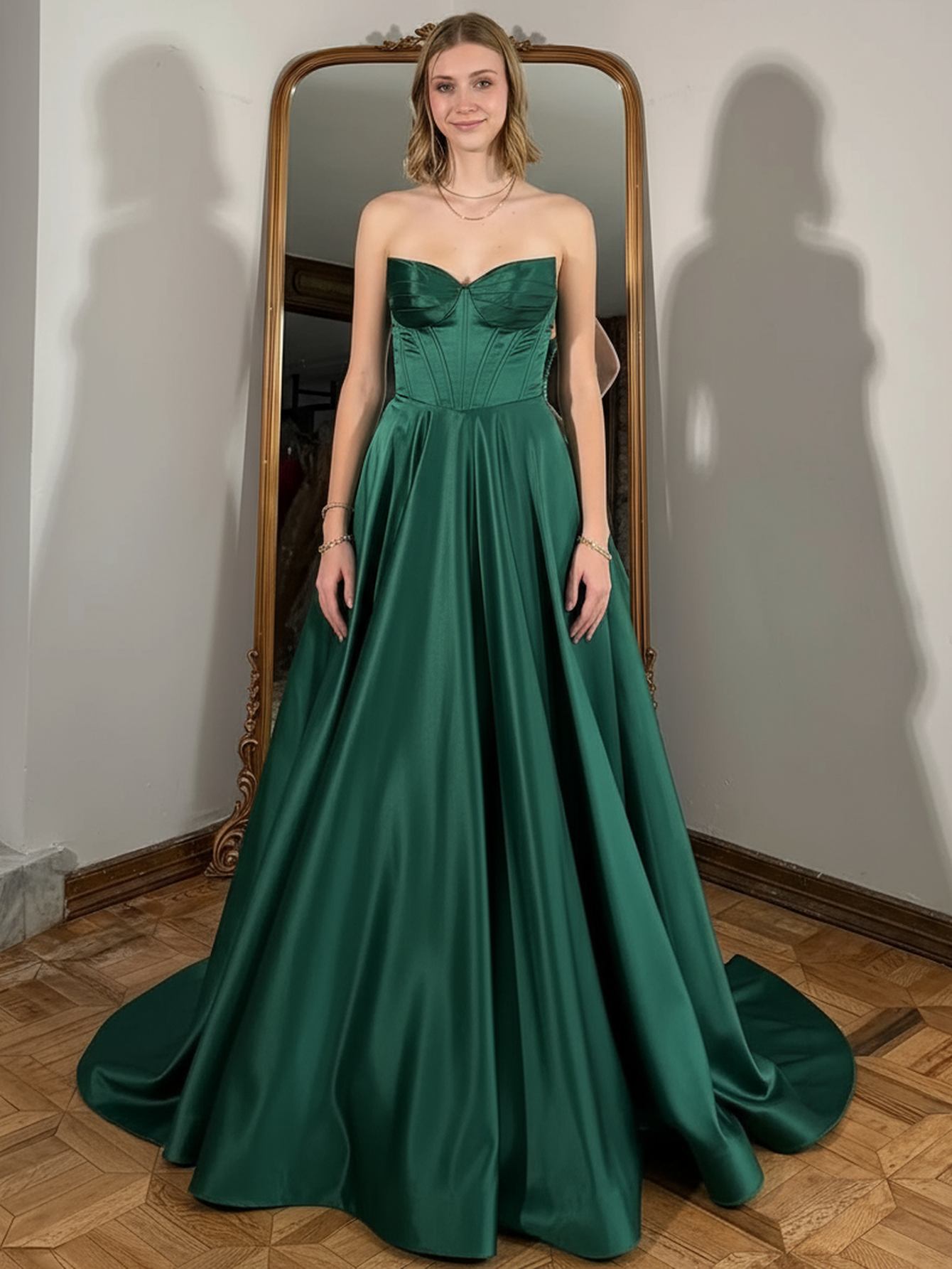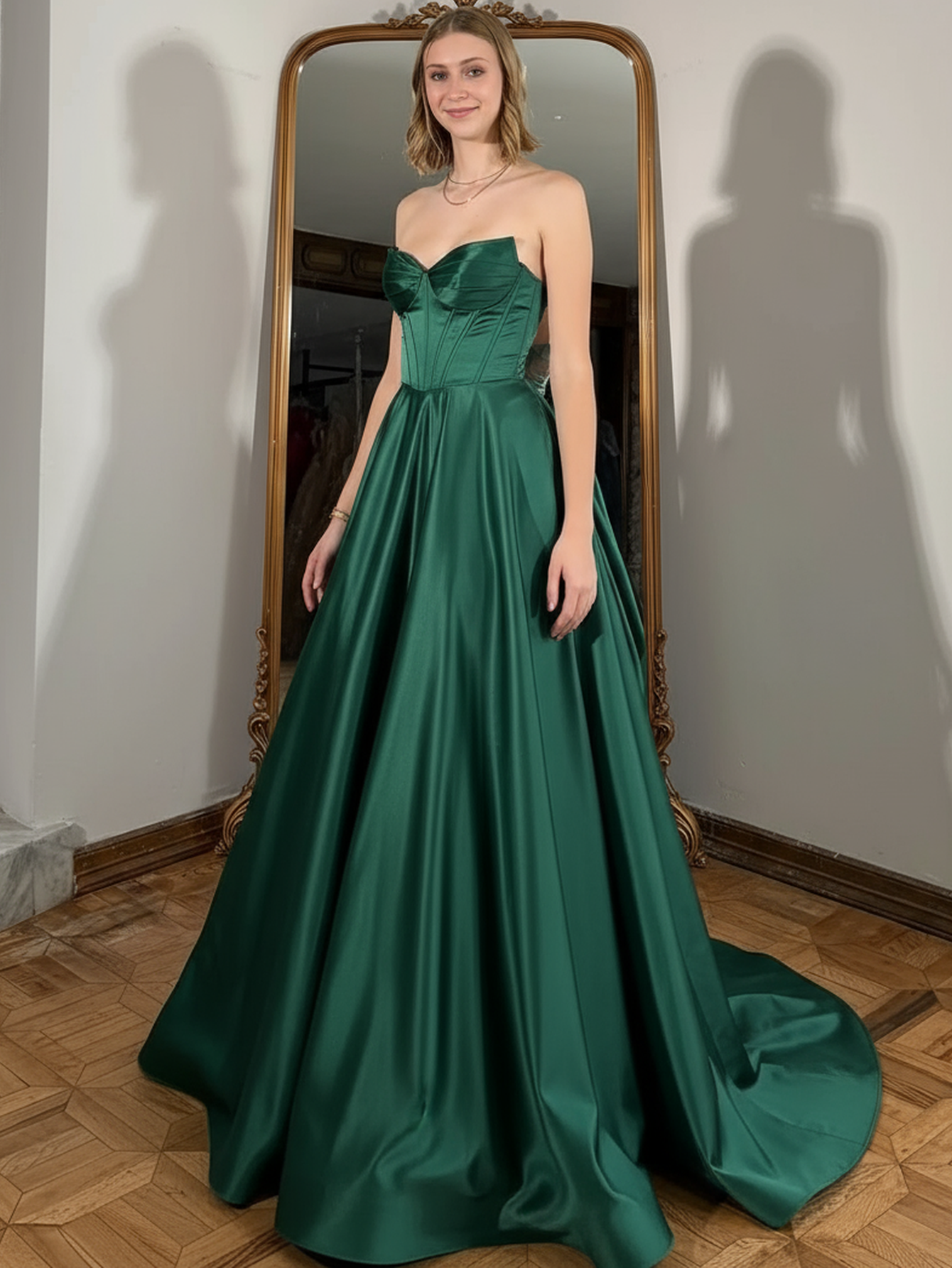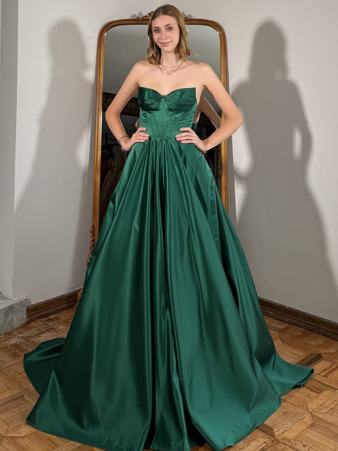 This satin prom gown features ruched bust on the bodice. The strapless dress has a v-neckline and pleated hem. Worldprom ball gown prom dresses are ideal for party, evening or festivals.