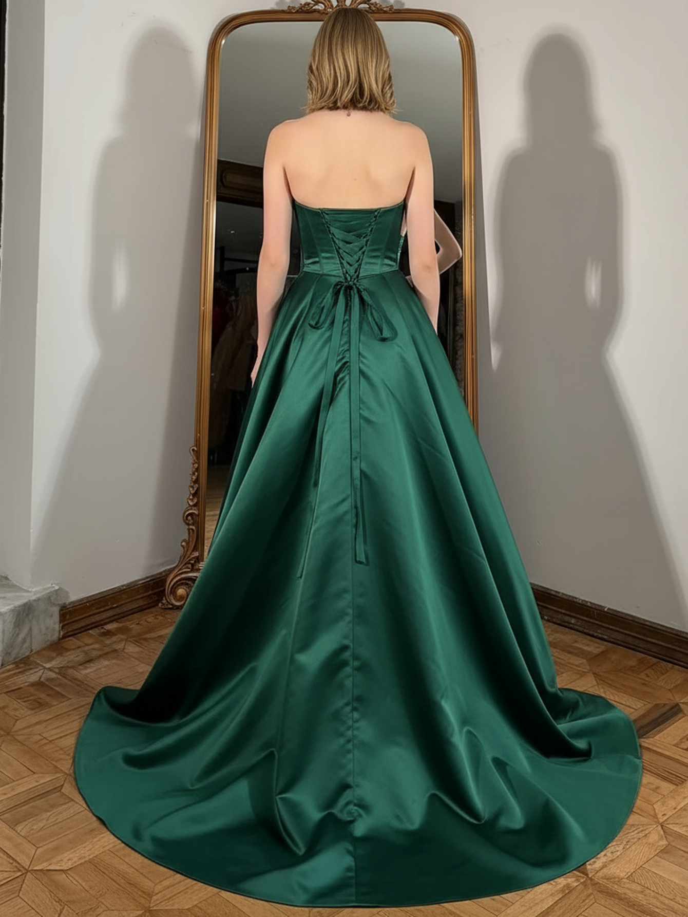 Strapless Ruched Lace Up Ball Gown Bodice Long Prom Dress - Green