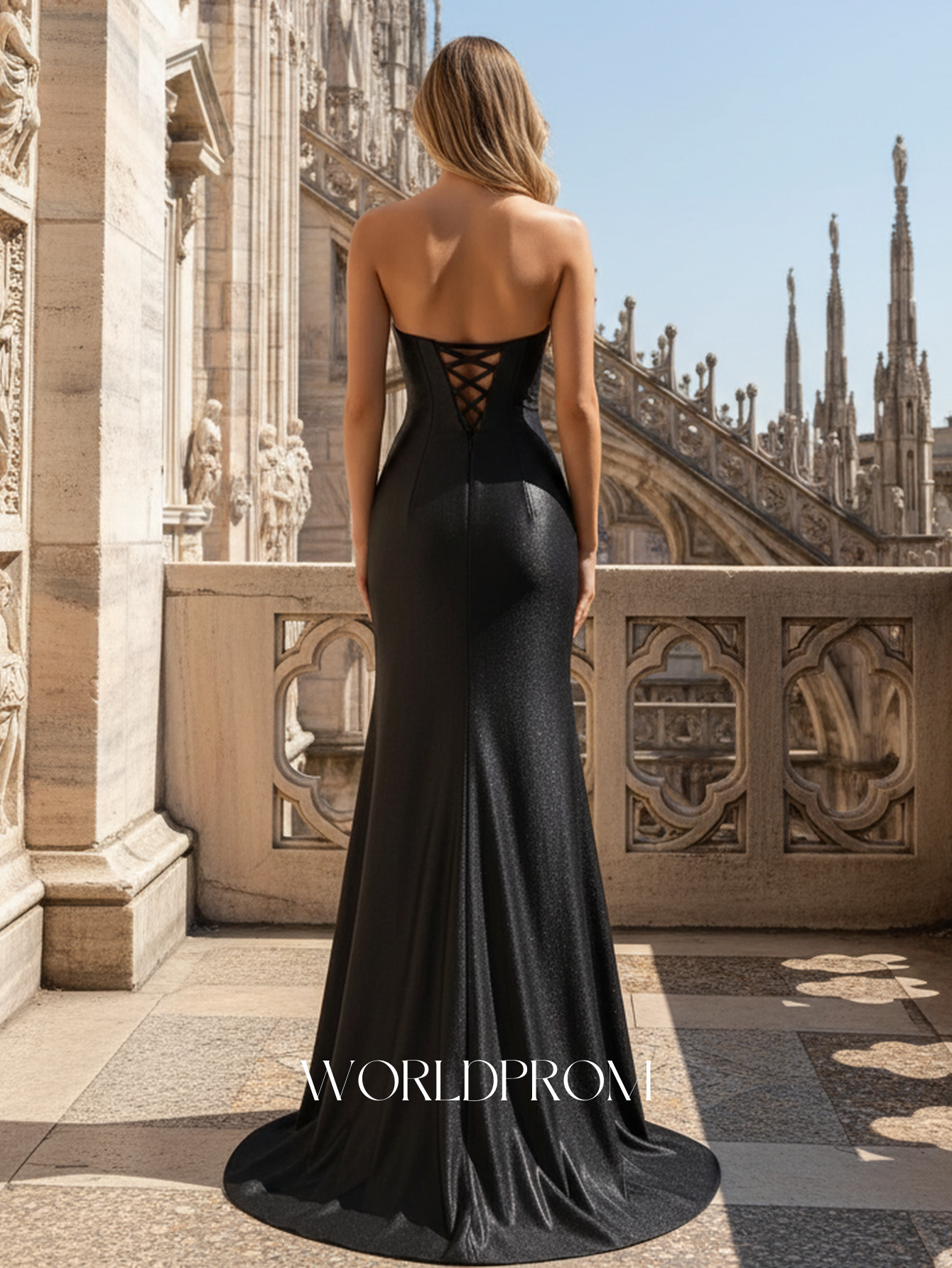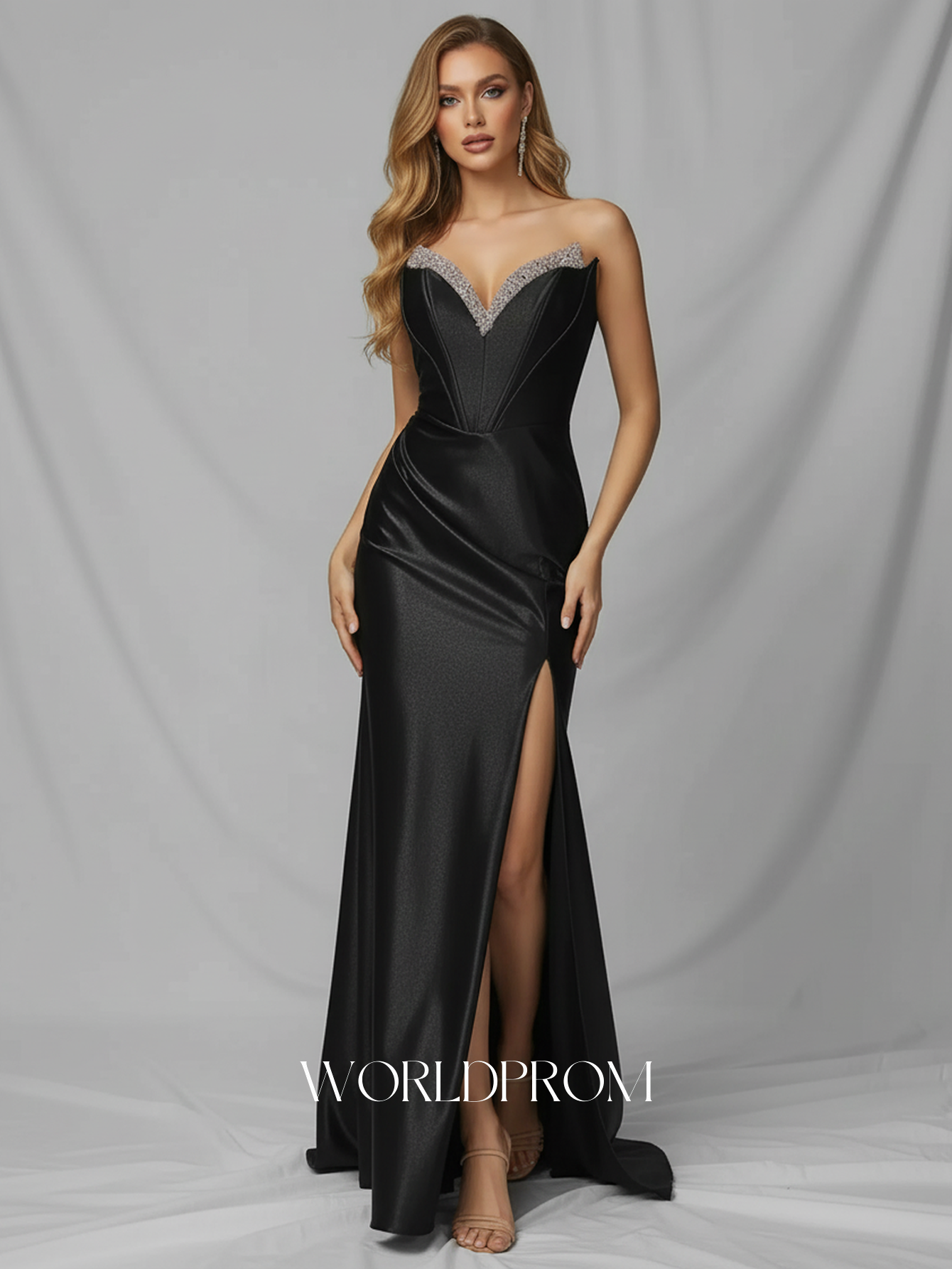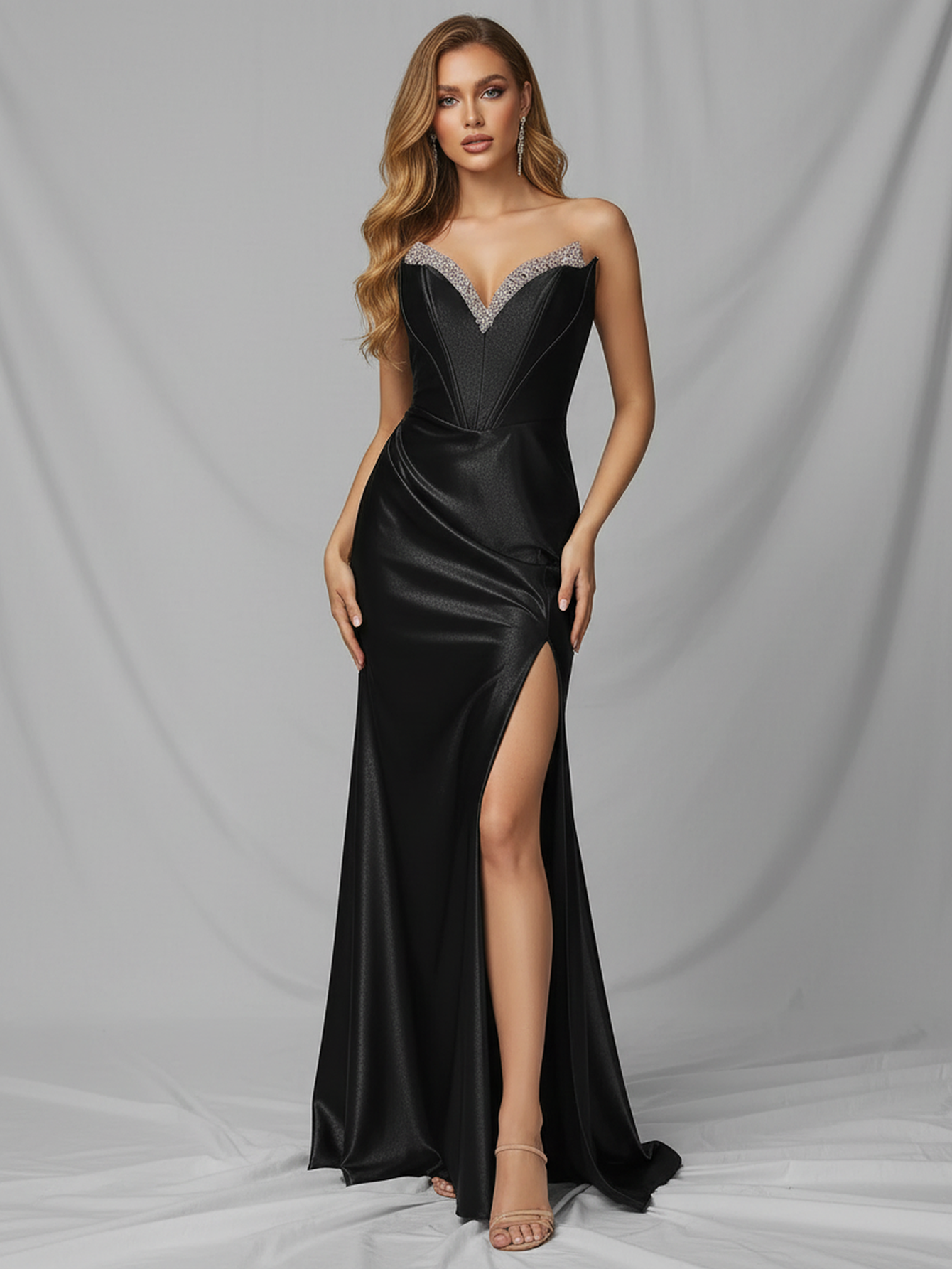 Strapless Satin Mermaid Long Prom Dress With Split - Black
