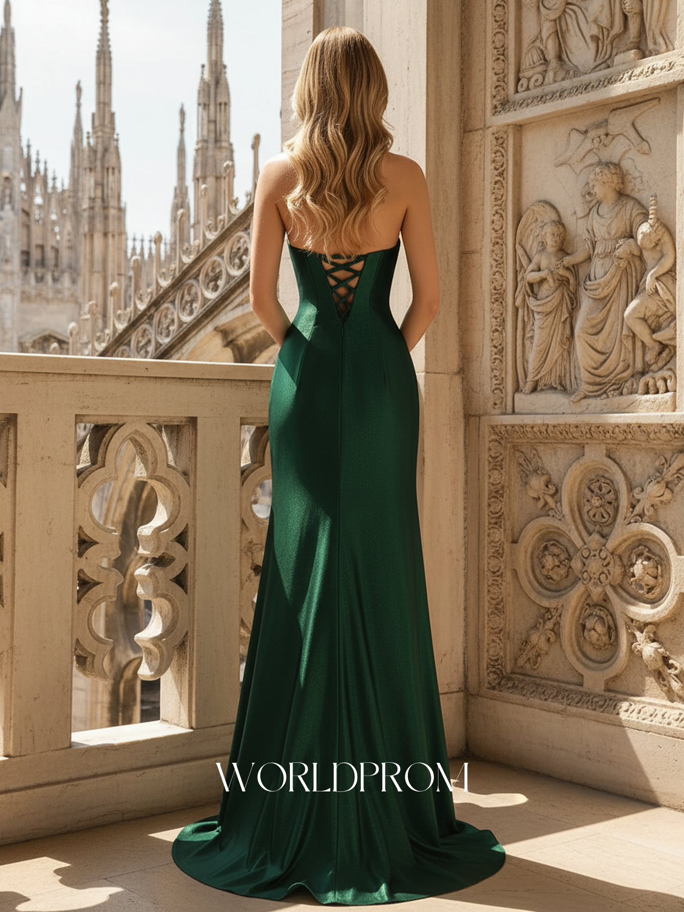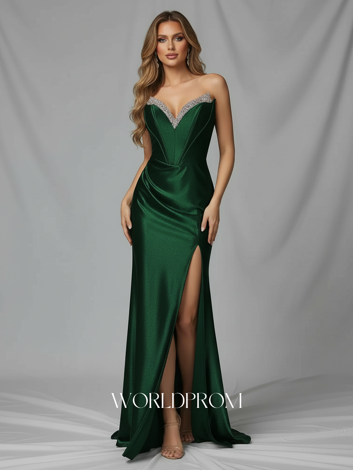Strapless Satin Mermaid Long Prom Dress With Split - Emerald Green