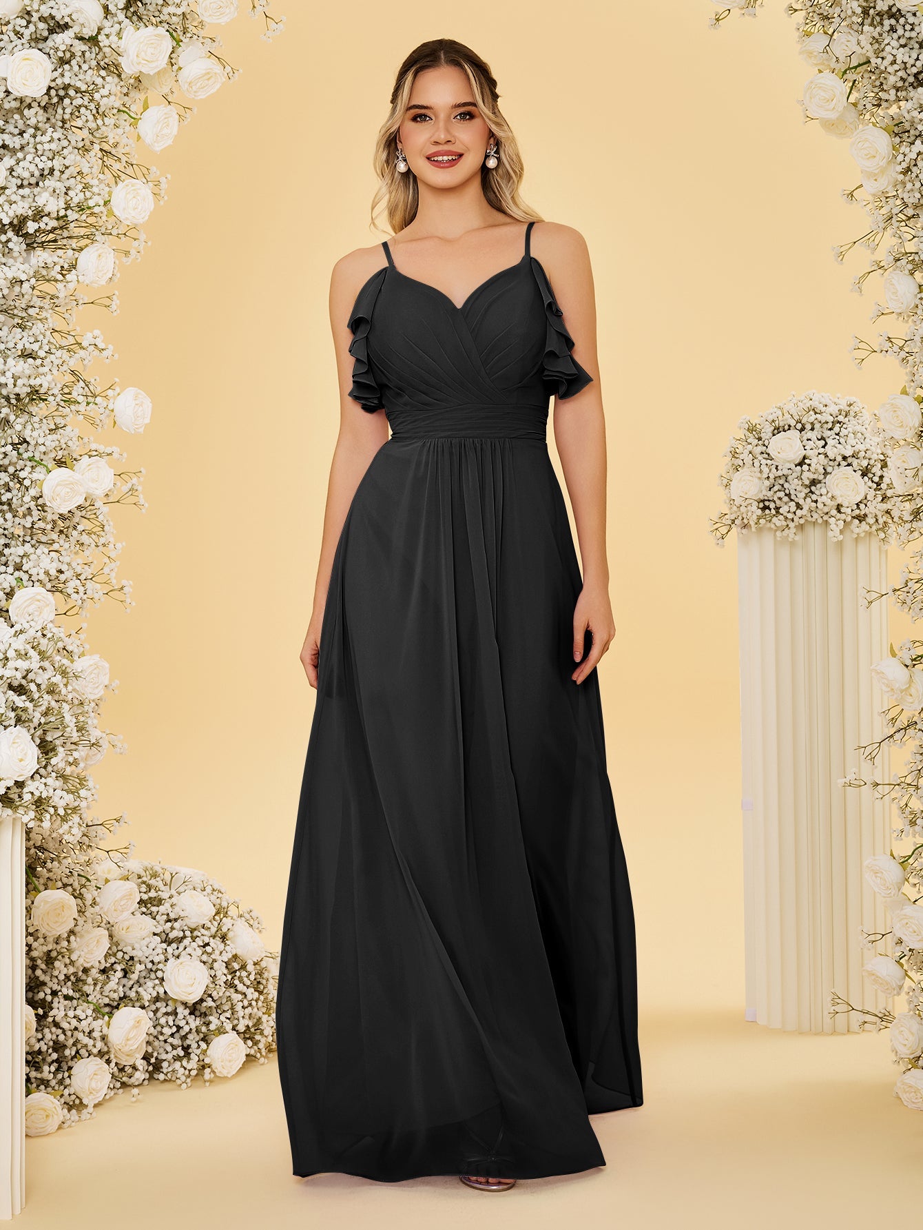 Sweetheart Bust Ruched Ruffle Sleeve Chiffon Bridesmaid Dress - Black
