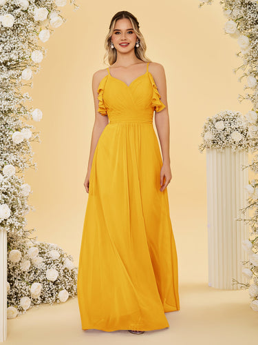 Sweetheart Bust Ruched Ruffle Sleeve Chiffon Bridesmaid Dress - Mustard Yellow