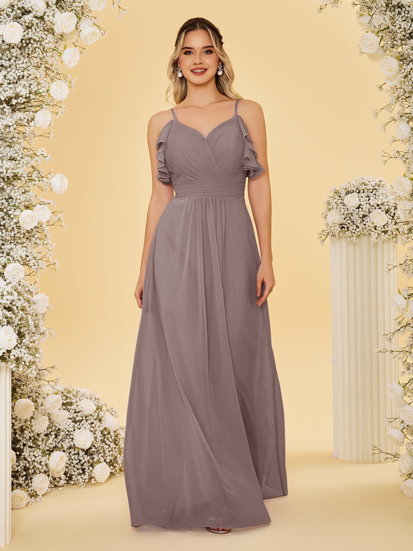 This chiffon bridal dress features ruched bust and ruffle on the bodice. The spaghetti straps wedding shower dress has a v-neck and pleated hem. The sheath lavender bridemaid dress is ideal for beach, outdoor wedding or garden wedding guest party.