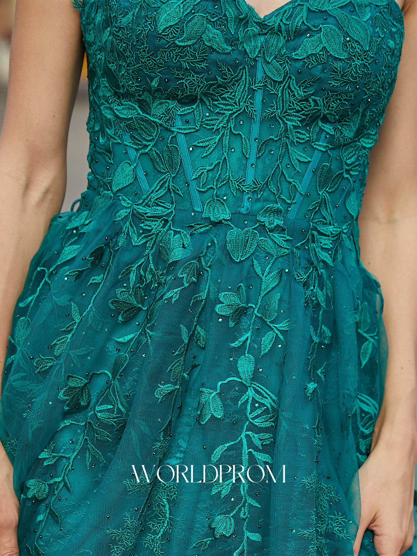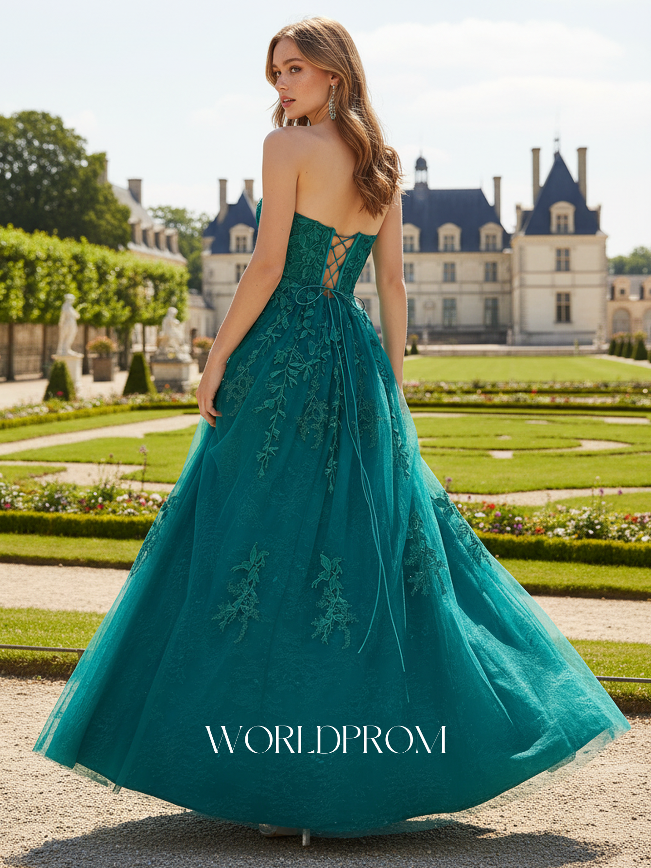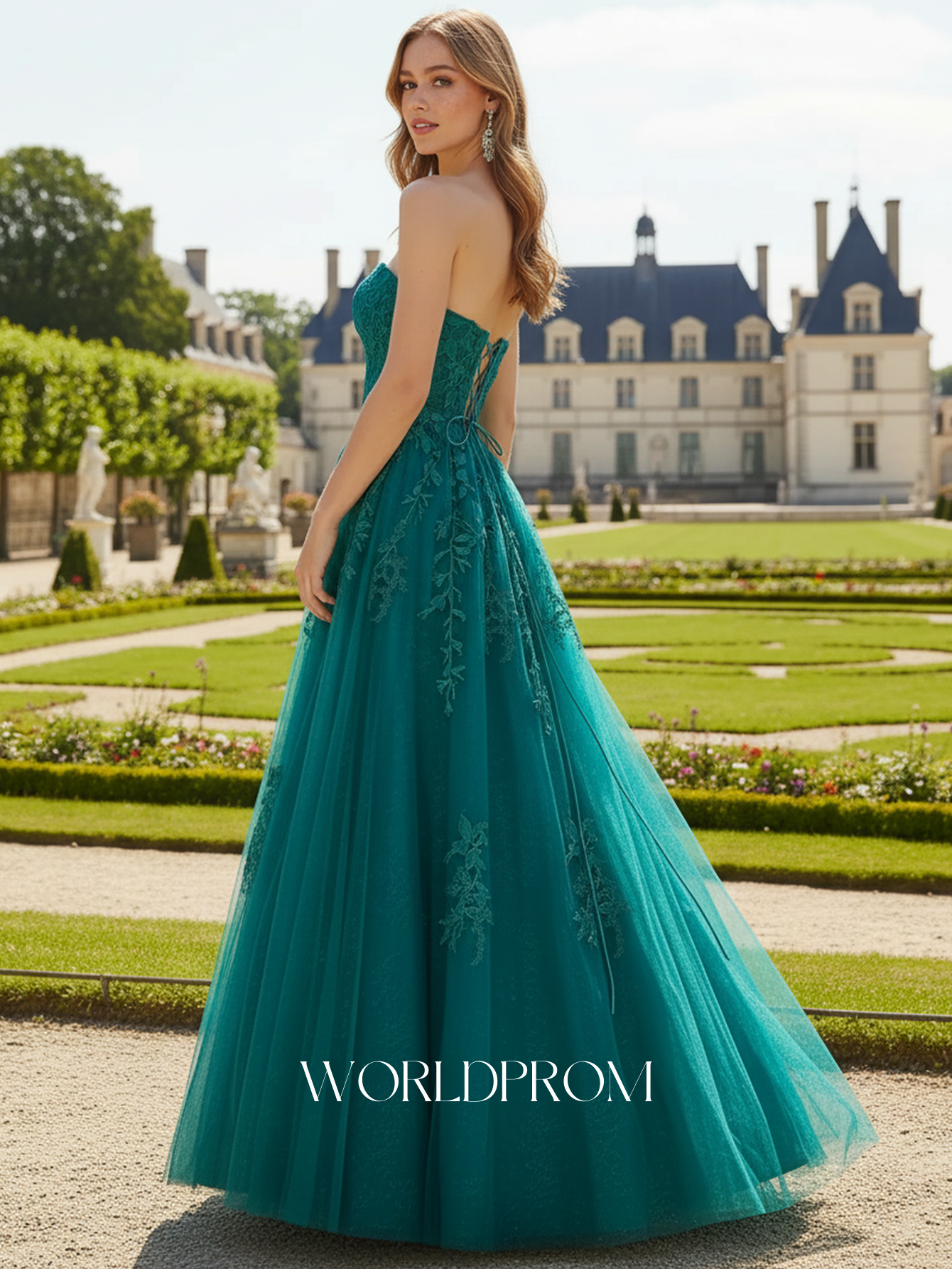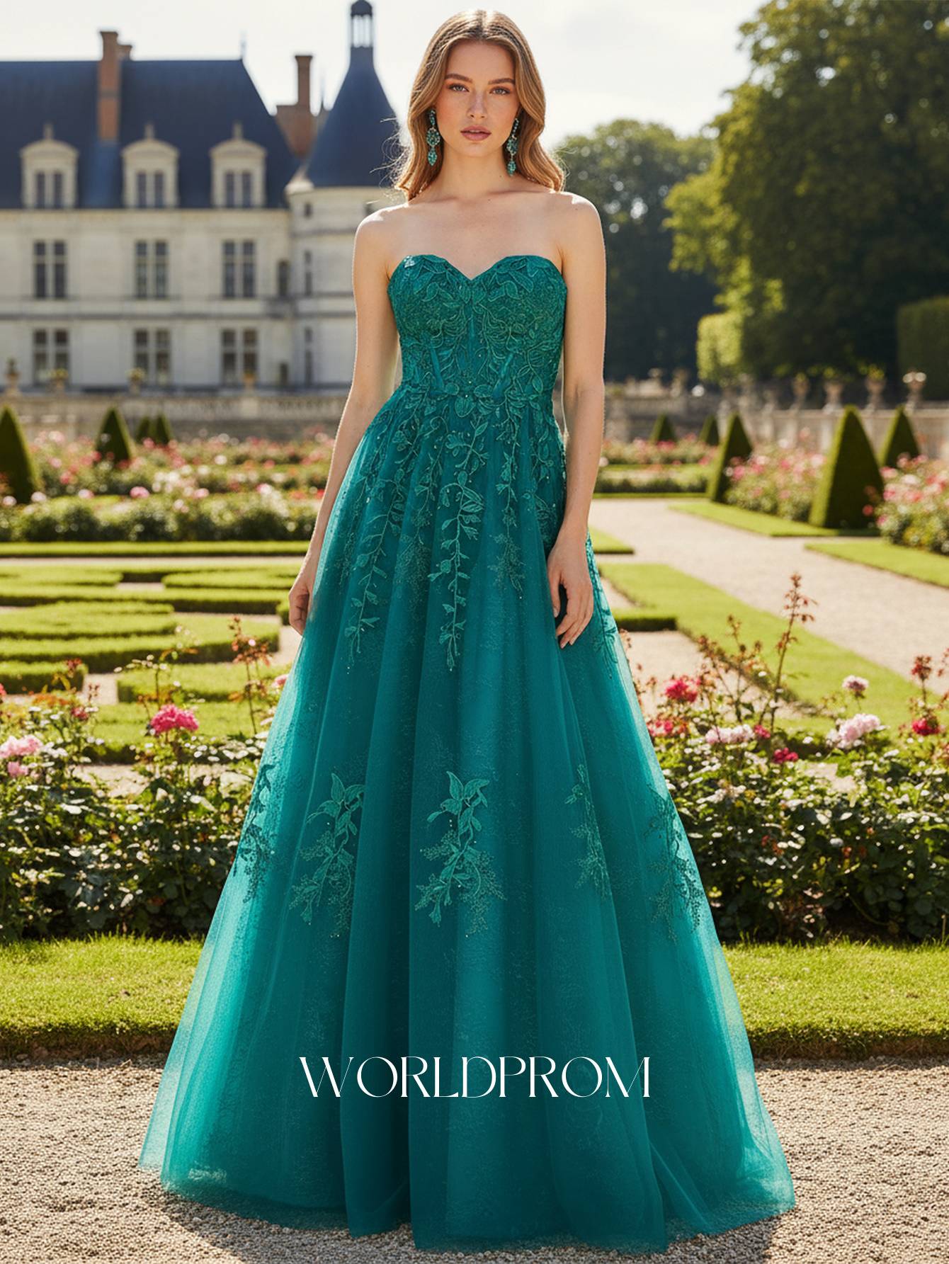 This tulle prom gown features embroidery on the illusion bodice. The strapless dress has a sweetheart neckline and pleated hem. Worldprom a-line prom dresses are ideal for party, evening or festivals.