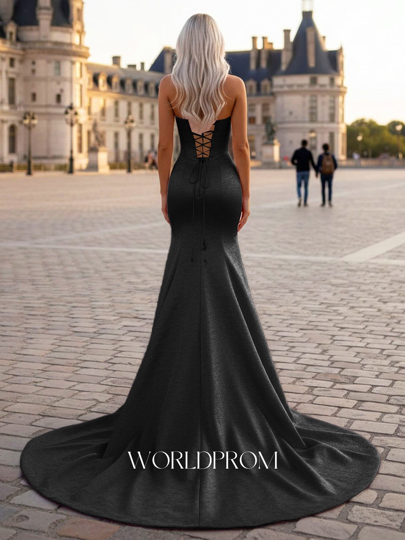 This satin prom gown features lace bust on the bodice. The strapless dress has a sweetheart neckline and split hem. Worldprom mermaid prom dresses are ideal for party, evening or festivals.