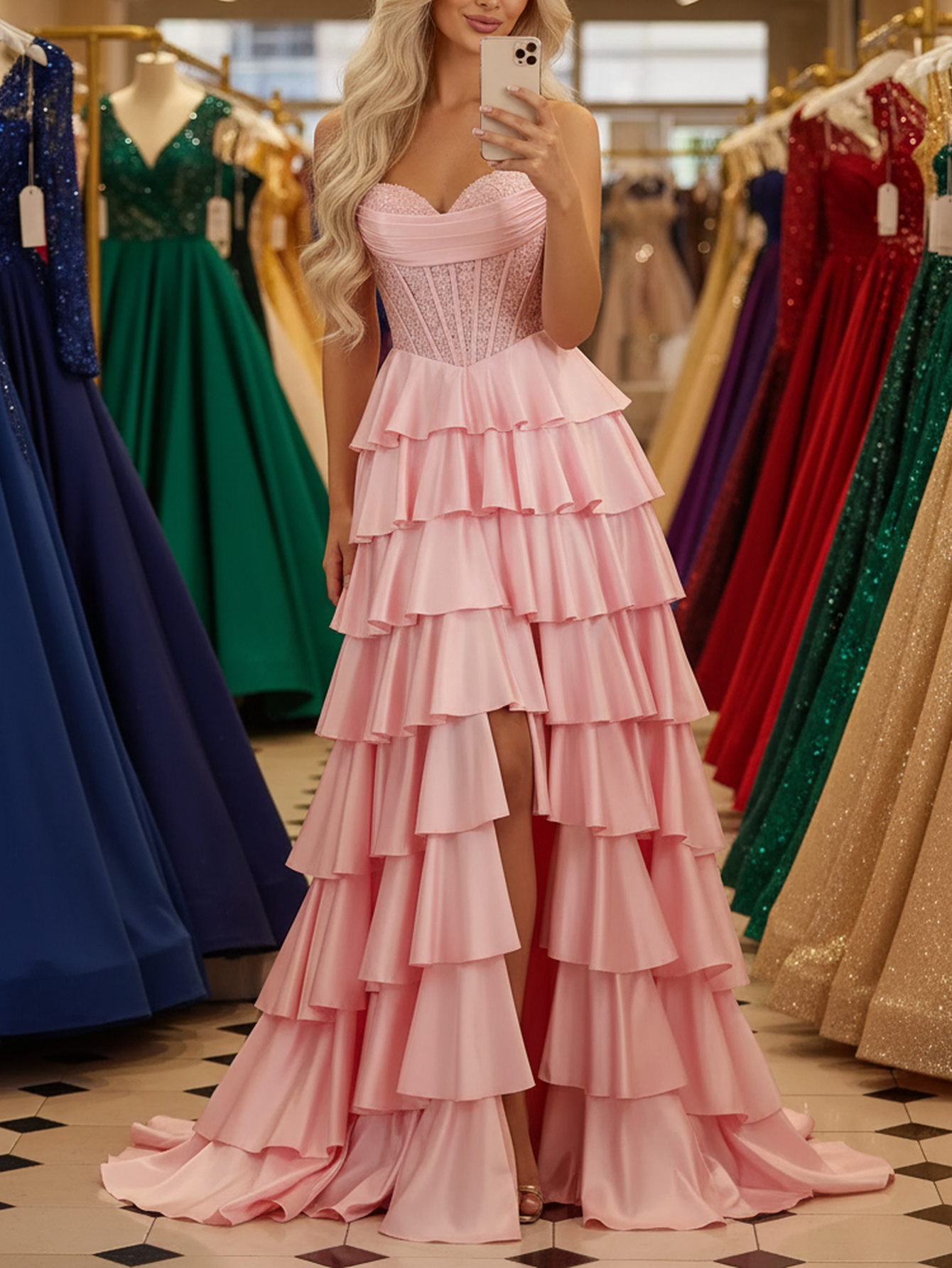 Sweetheart Lace Ruched Bust Ruffle Hem Long Ball Gown Prom Dress With Slit - Pink