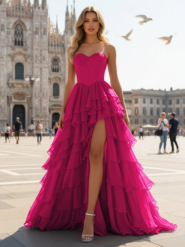 Sweetheart Pleated Bodice Layered Ruffle Hem Long Prom Dress With Slit - Fuchsia