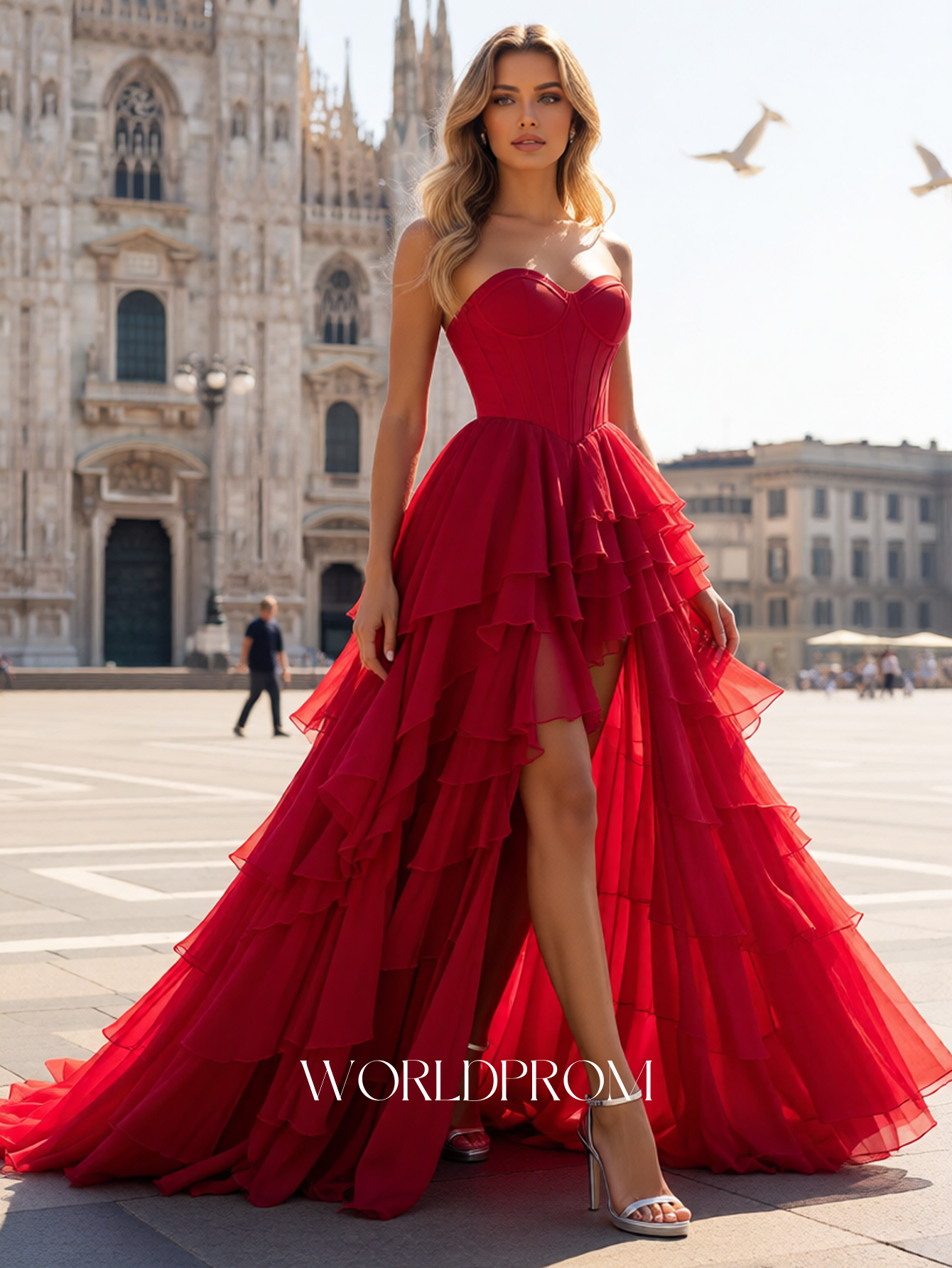 Sweetheart Pleated Bodice Layered Ruffle Hem Long Prom Dress With Slit - Red