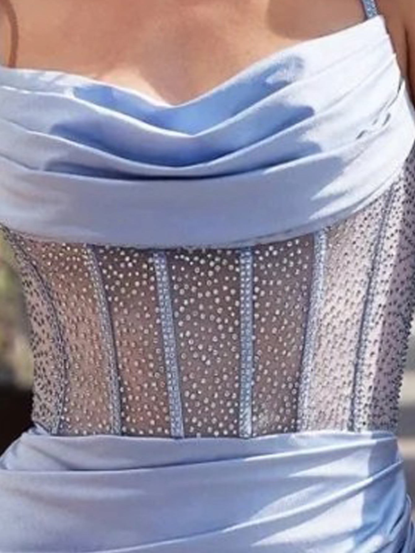 Sweetheart Spaghetti Strap Beading Ruched Illusion Bodice Mermaid Prom Dress With Slit - Light Blue