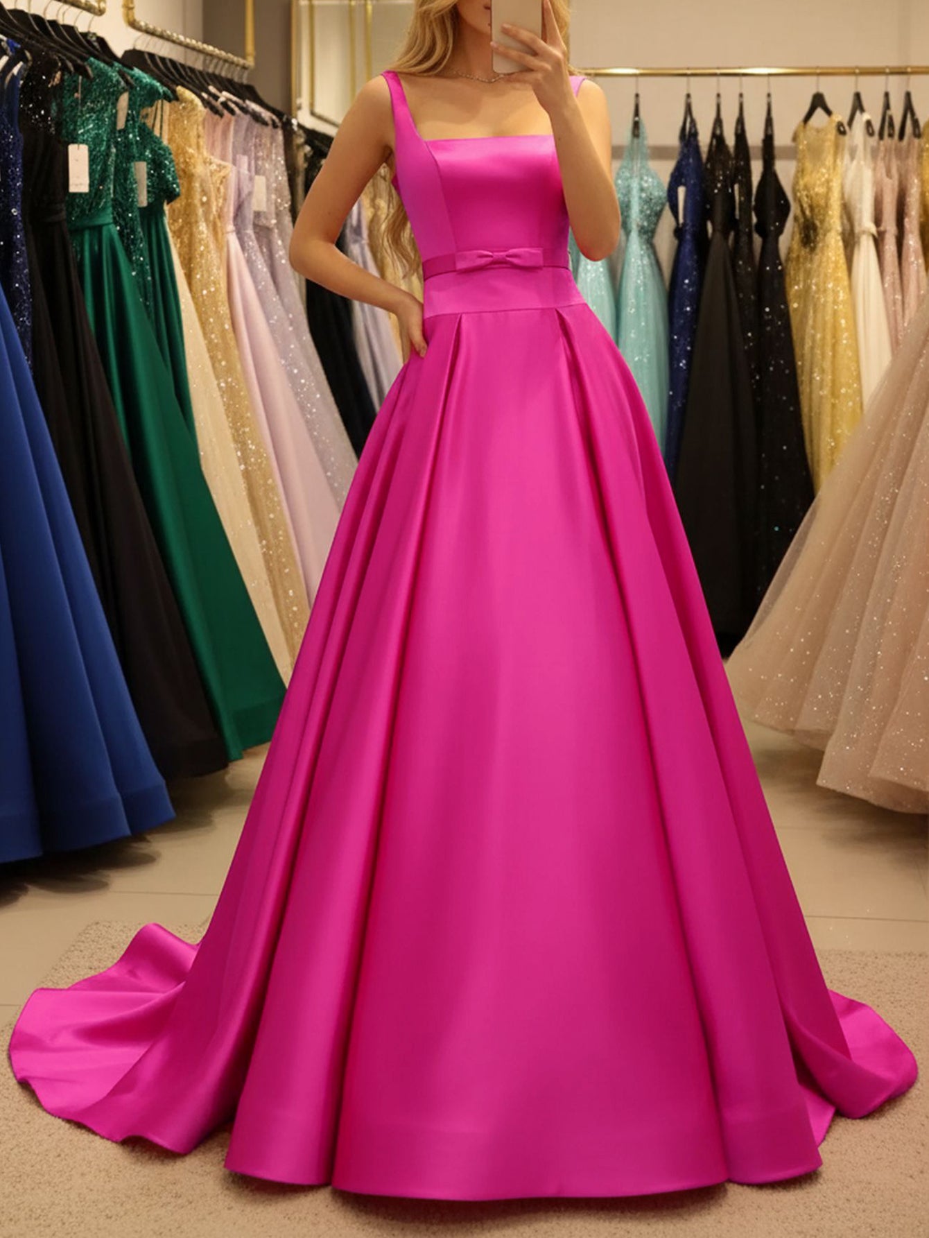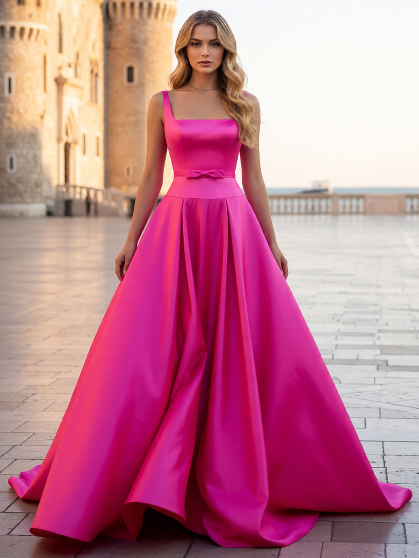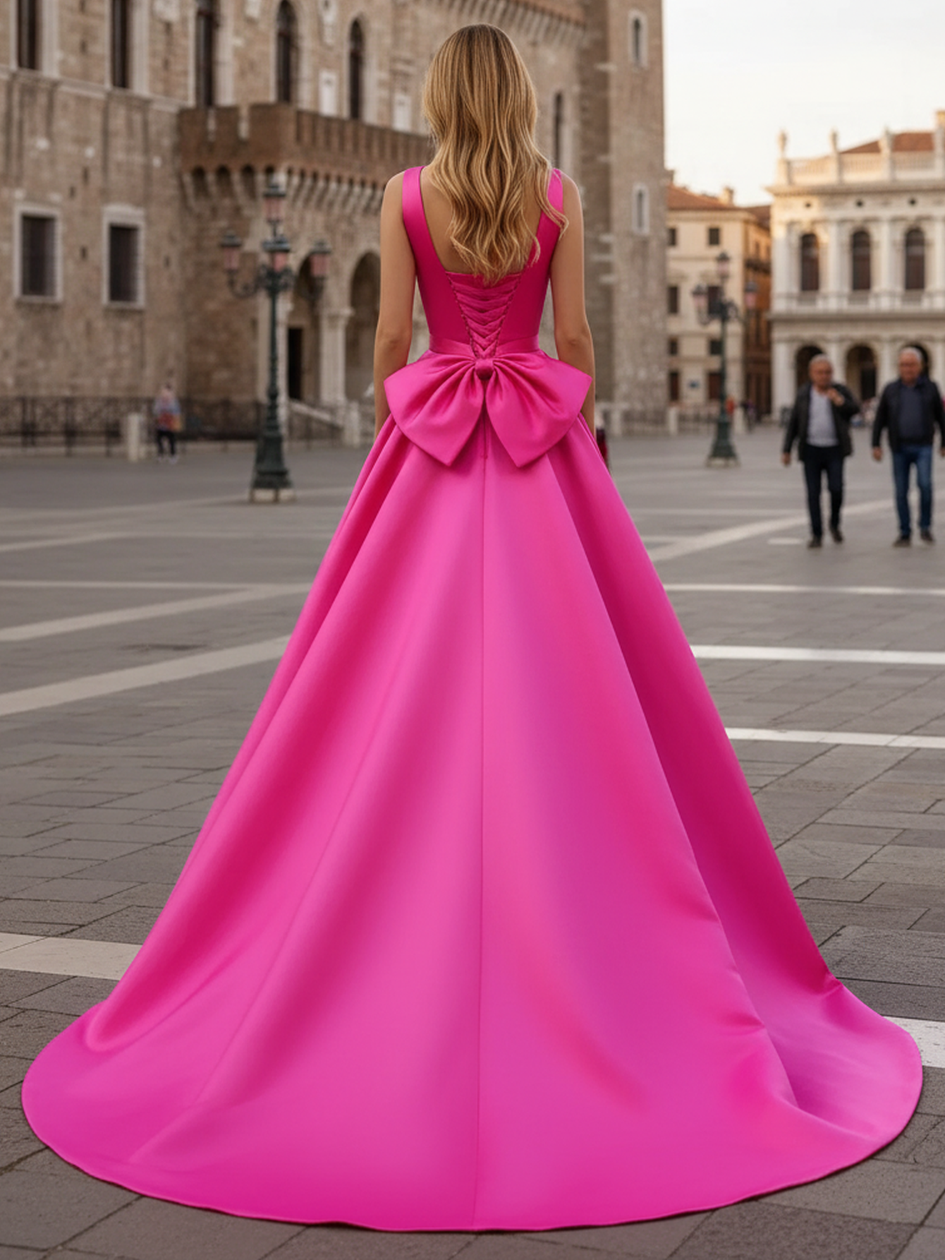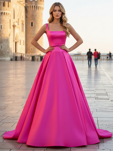 Tank Bow Coset Lace Up Ball Gown Long Prom Dress - Hot Pink