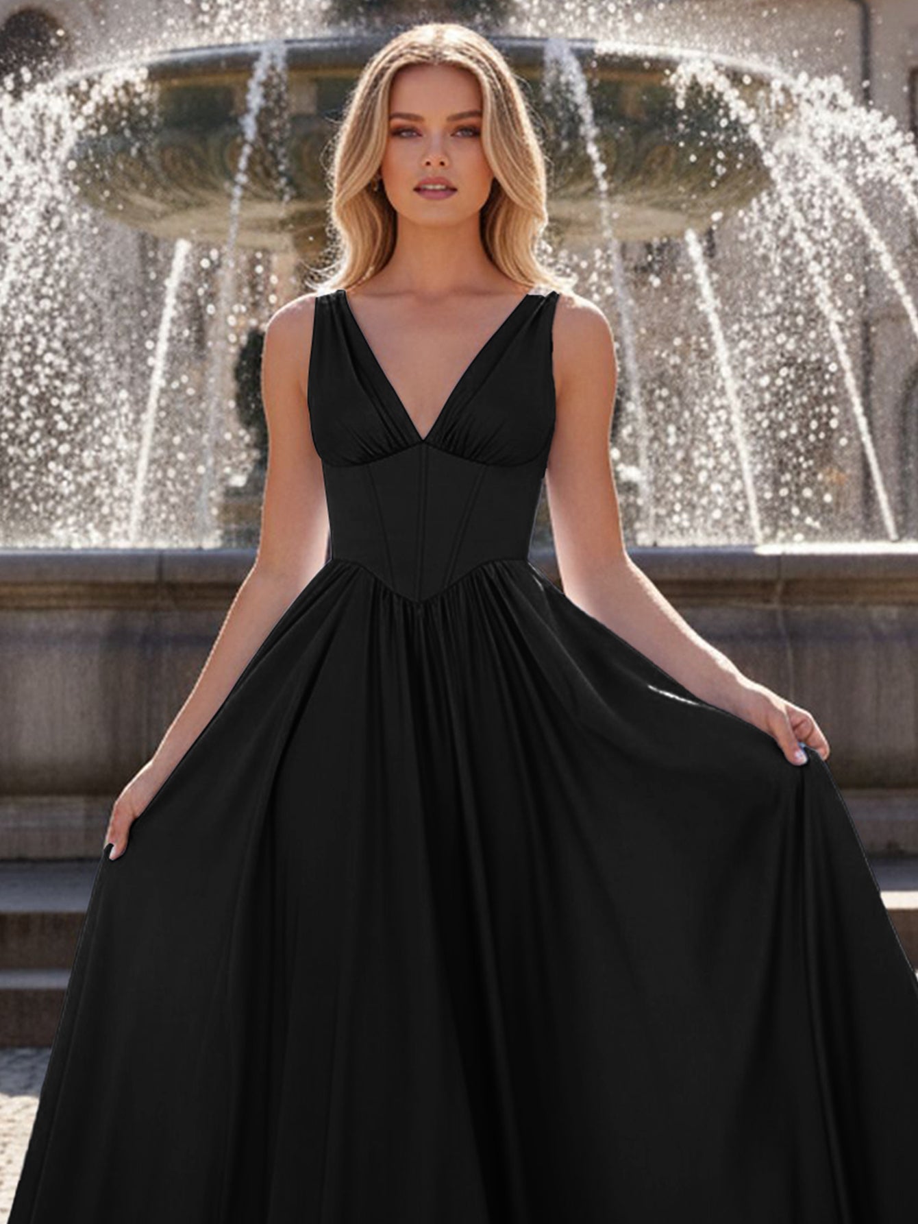 This satin prom gown features boned with crystals on the bodice. The tank top evening dress has a V-neck and pleated hem. This classy ball gown dress is ideal for party, evening or festivals.