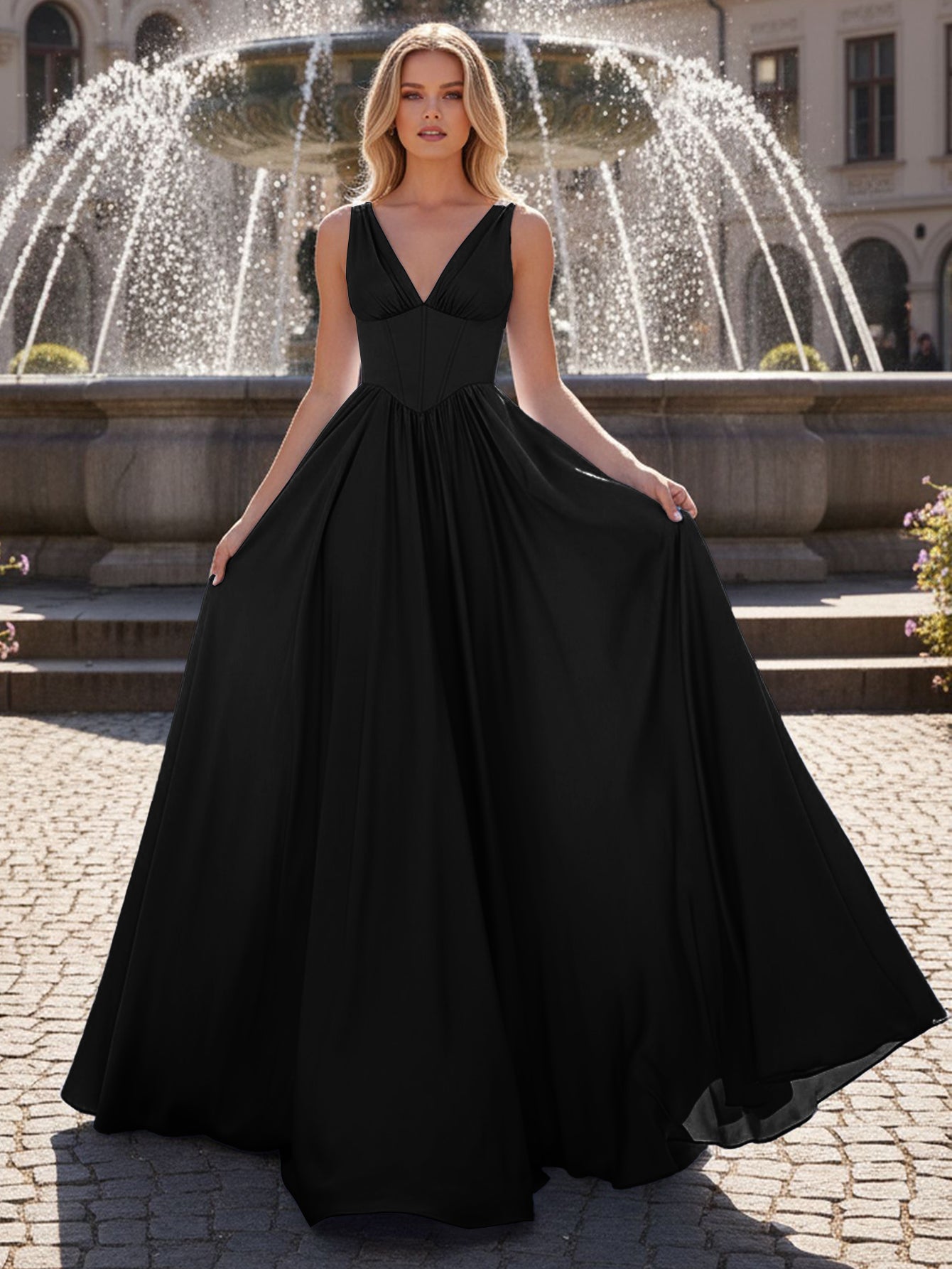 Tank Top Boned V Neck Ball Gown Prom Dress - Black