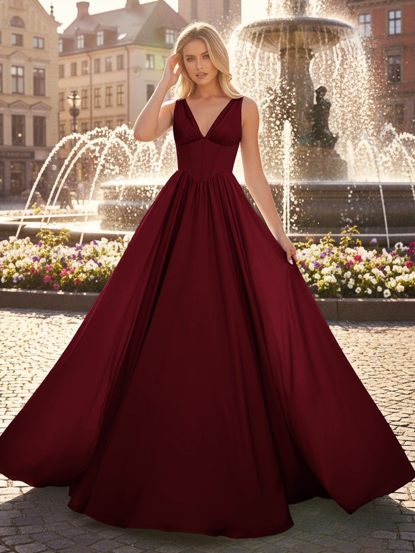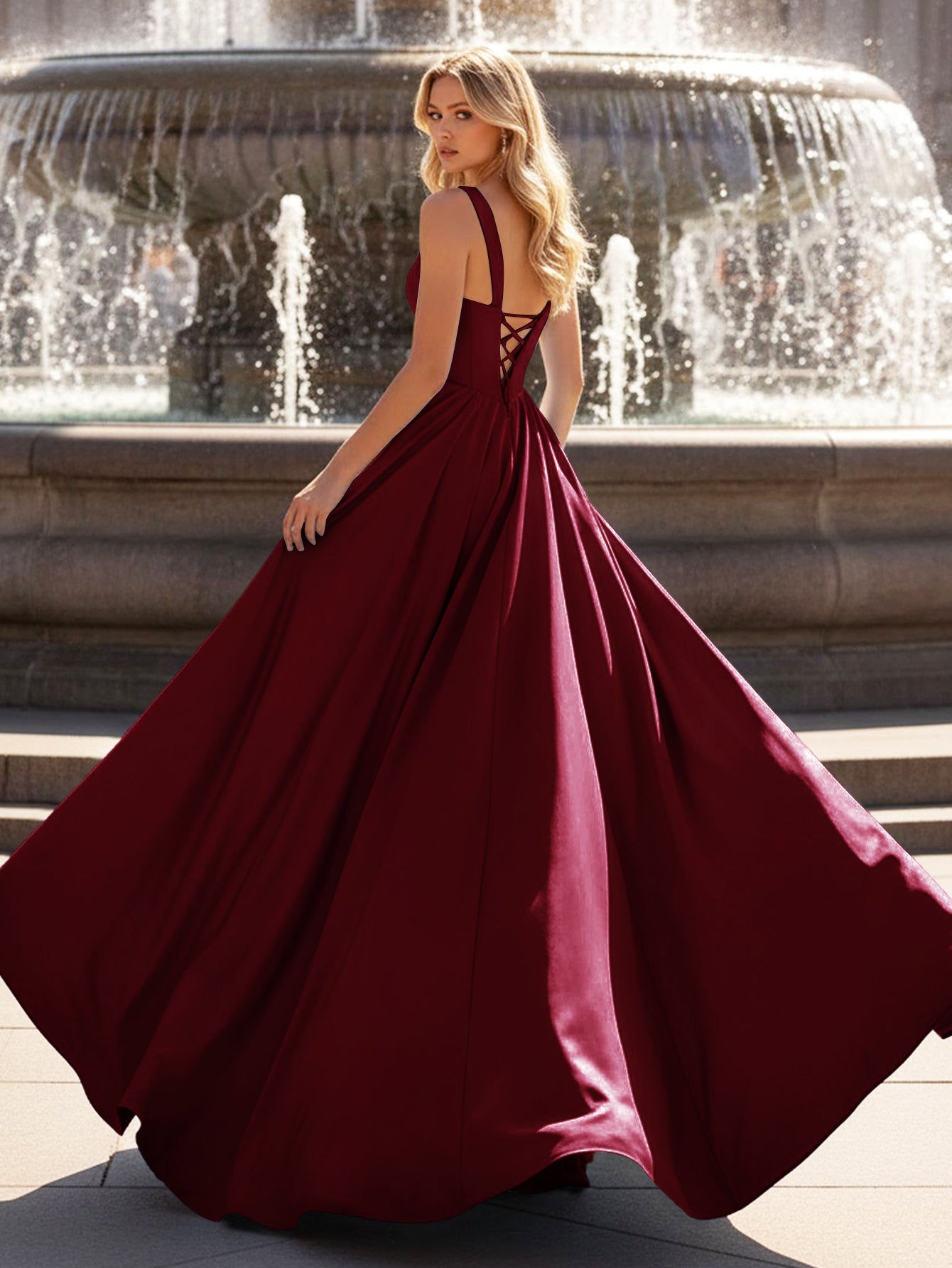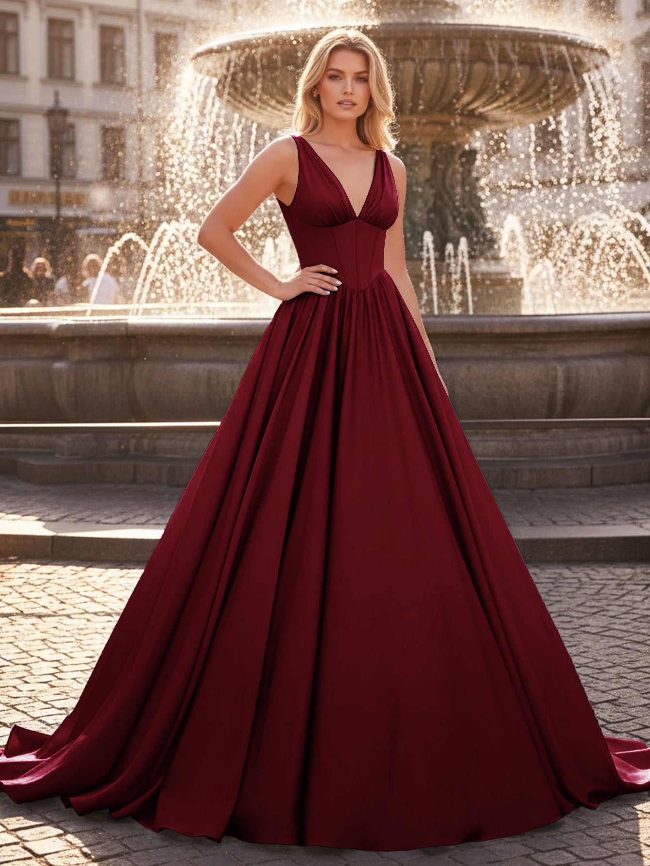 This satin prom gown features boned with crystals on the bodice. The tank top evening dress has a V-neck and pleated hem. This classy ball gown dress is ideal for party, evening or festivals.